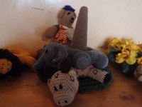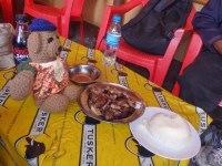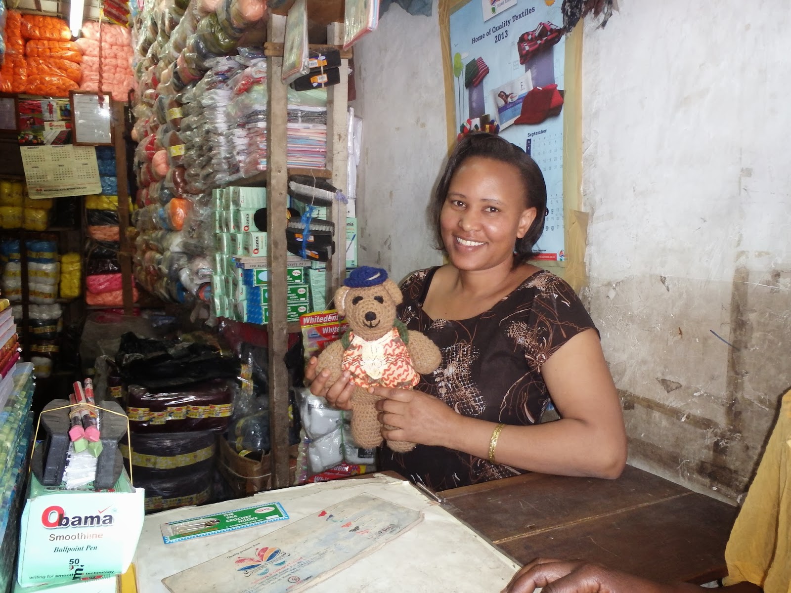 Barnabas has been around the yard and house getting adjusted to his new surroundings and of course getting all the sleep dust out of his eyes. Those who meet Barnabas all want to shake his hand and see what is in the backpack he never goes anywhere without. The first order of business for Barnabas was checking out the home of William and Martha Makali who have so graciously hosted me. After that he played with the child development tool made by Lynda S. at Mauldin United Methodist Church. Not surprising he could not get the animals on the cone in the right order his first (or second) try. After that he wondered if he could go about starting ministries like those at home in making bears or better yet the crocheted Frisbees that I love so much. After a full morning in town going from shop to sho we gave up on finding yarn and crochet needles in the size we are used and settled on a 1.9mm needle (the biggest they had) and yarn appropriately sized (also the only style of yarn they had). The skein of yarn and one needle cost 2200 TSH (shillings) which is about $1.37 US. I did make a Frisbee but the yarn is so light it will not fly more than a couple of feet without getting blown off course by even the slightest wind. Next one I will make will be out and back to make a double layer Frisbee to see if that gives it enough weight. Will also have to add weight to the outside rim to get a strong spin going. Pictures of Barnabas at the house and with the shopkeeper and at lunch to the side full album at Barnabas Bear’s Facebook page.
