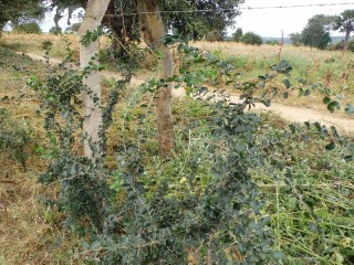 It took 6 1/2 hours to get most of it done, still have one area to work on. My help left at lunch time but I was still very appreciative of what he did. I officially quit after I accidentally got into a hornets nest around one of the trees. 6 stings before I got of the area and one directly on my chin-which amazingly enough never got swollen. Being out of bee and wasp spray already I had nothing to clear out the nest with so my day of cutting grass was done. I then went about tying up the bushes they wanted to train to cover the fence so they would grow up the fence. Something about these bushes-they have those nasty 2 to 3 inch thorns that are as strong as steel. Despite wearing gloves and long sleeves I got a lot of very small puncture wounds over the day. Not to mention some nasty blisters.