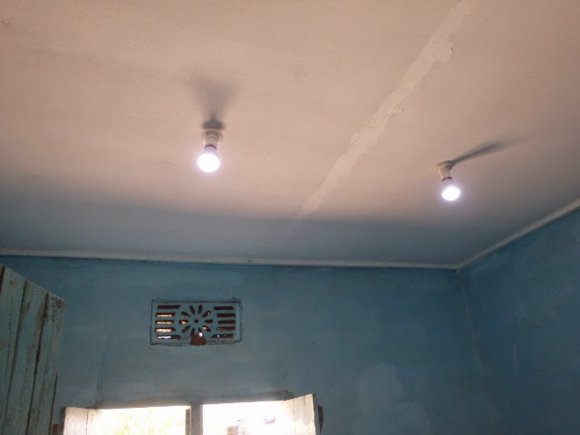 Thursday afternoon and most of Friday I spent the day working on the solar power system for the medical clinic which has become non-functioning. Basically it does not keep enough of a charge to run things first thing in the morning or overnight. Or at least the DC to AC inverter and the five phones they are constantly charging. One thing I have learned those phones are important, many operate as the flashlights by the staff members. The lights were removed from the building previously and there is some question as to by whom but I will go with the evidence on that factor. I had brought out four new lights, this time DC lights. I was thinking that the lower power DC lights may take four to properly illuminate a room for medical purposes. After a test run, the doctor felt two per exam room and his office would be sufficient but I explained a plan to create some directional lamps that would be DC powered as well and he liked that idea. So after going through the mess of cut up wiring above the ceiling, I found enough pieces to properly wire two rooms. Now the next step was figuring out how to rewire one of the switches still in good condition to interrupt a DC light circuit instead of the AC system they were designed for. It took two tries to make sure I had it right but then we were in business. Unfortunately the only ladder on site is made from spare wood parts and is a straight ladder-nothing to do the work at ceiling height. So I had to lower the cables down to working height standing on a chair and then pull the cables until the light fixture was at the ceiling. Not my best work, but considering the obstacles I will take it.