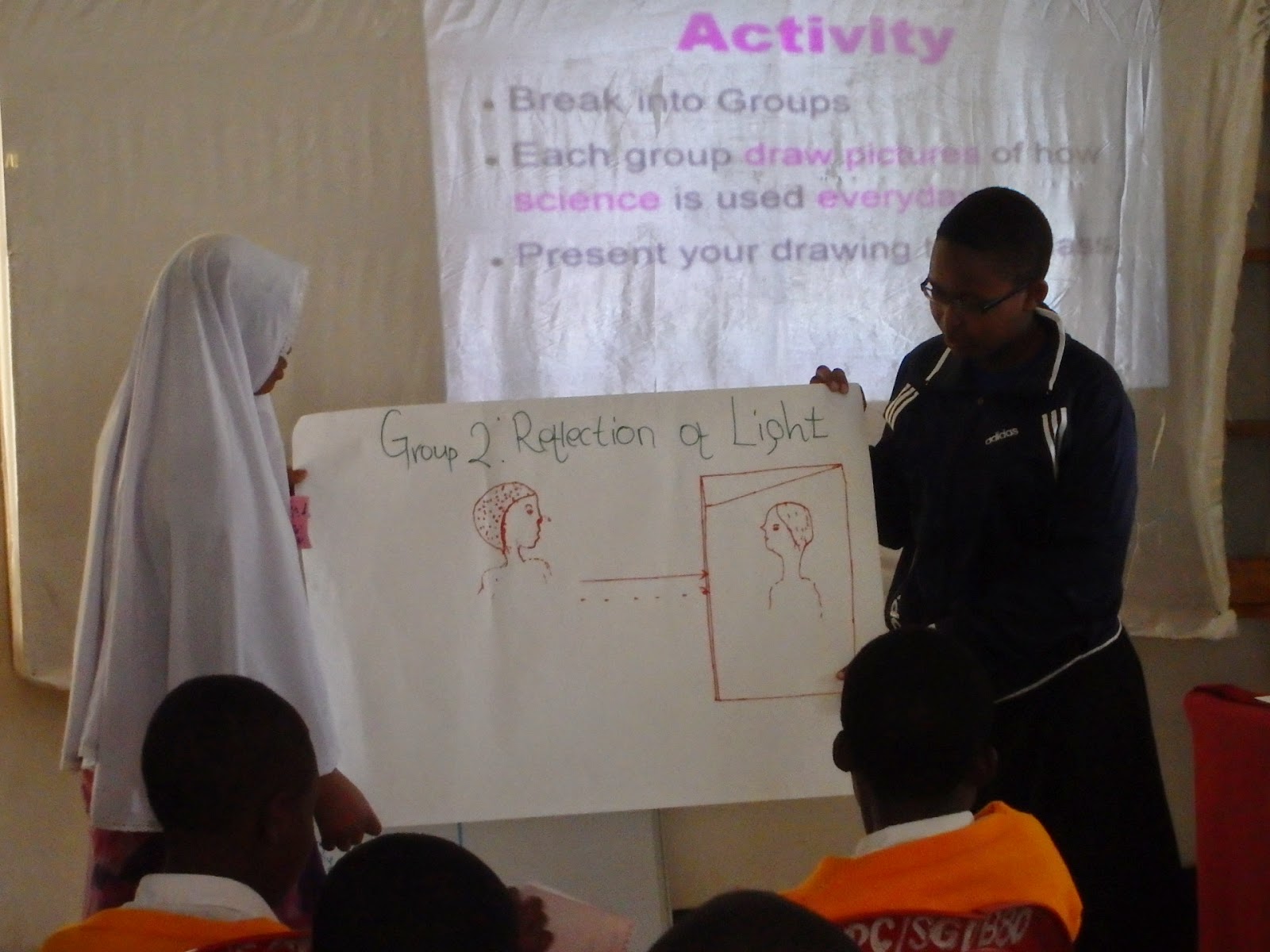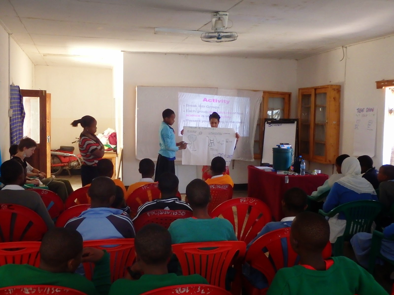 I participated in Saturday when they did their science talks and experiments. As part of the section they had them break into groups to draw everday things in their life that have some type of scientific element and to then present their drawing and talk about what it has to do with science to the whole group.