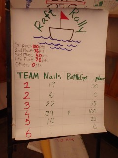 The other part was to do break into teams where they had to work with girls from the other schools to compete in three competitions. The first was pretty neat. They were to make boats from a sheet of aluminum foil about the size of a piece of paper. Not only did they need to float but the competition was to see how many bolts they could hold. The team that won held 39 bolts before their boat sank.