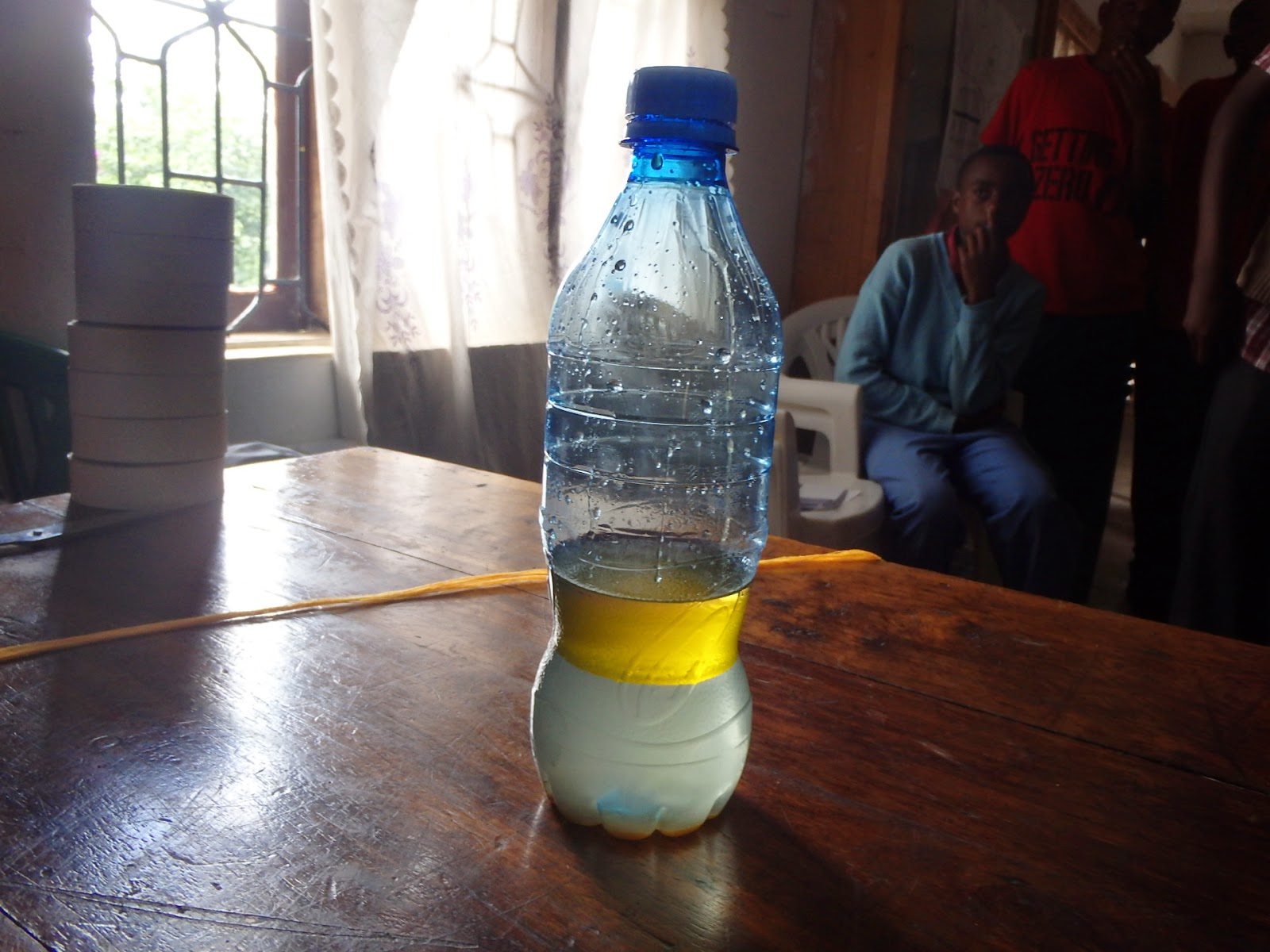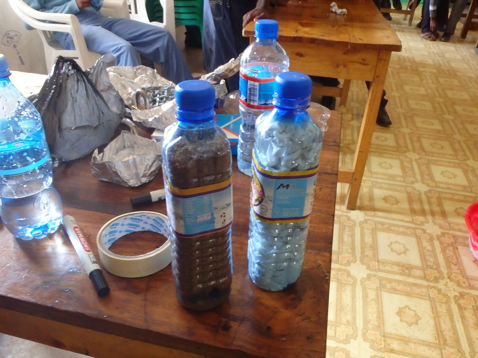 The other competition was a prediction of how different liquids would separate based on their density when mixed together. After every team turned in their predictions we did the actual experiment and each team was awarded points based on how many they got right. The liquids were a cooking oil, gasoline, water and honey. The only ones that were missed were the cooking oil and gasoline since they were so close in density they were difficult to tell apart. As an example of density two empty water bottles of the same volume were filled-one with toilet paper and one with sand. Then the students were asked to come up and determine which felt heavier despite having the same amount of volume.