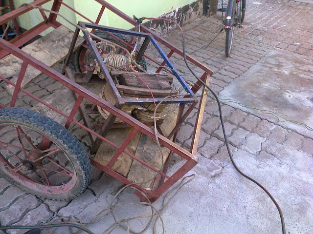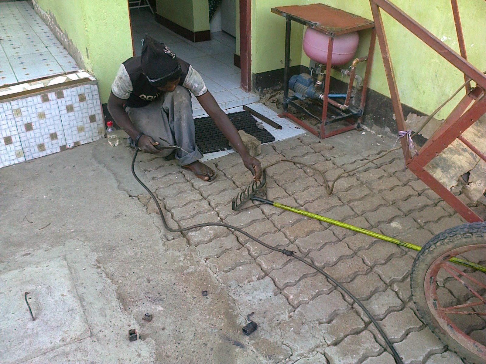 There are several welders along the street to my hotel that I walk past every day I am in town and my plan was just to take it to one of them and see what they could do. The first afternoon I was in town though, the hotel was having some work done. Luck would have it that they were welding some protective frames for their water pumps.