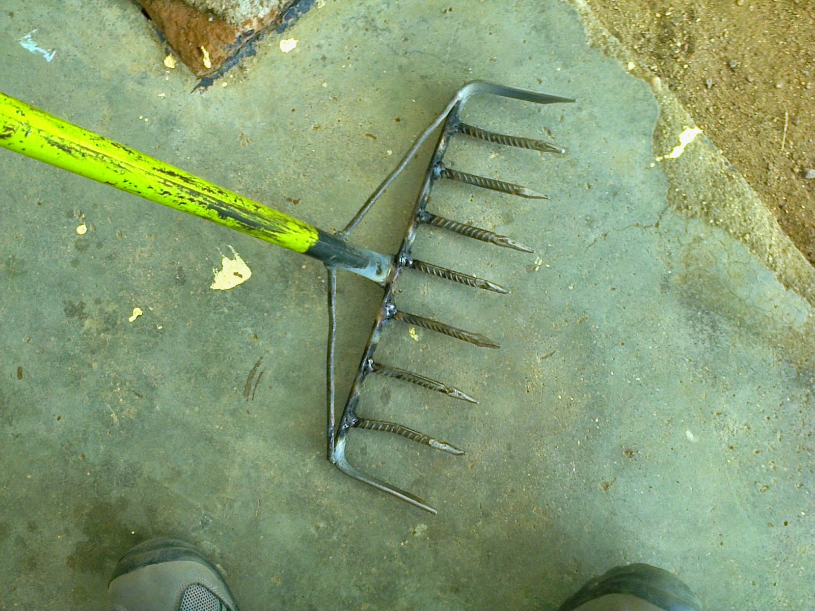 The rake is more like non flexible rakes used raking through dirt before planting it. Well after about one year two of our “tines” broke off from the rake. The tines are made of rebar pieces that are then sharpened. So I took the rake with me into town to have it “welded” back together. Though I suspected using some superglue might be better for it.