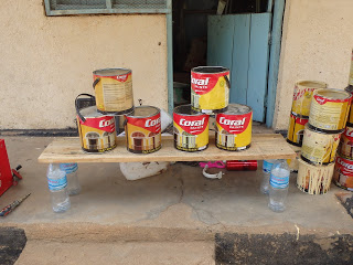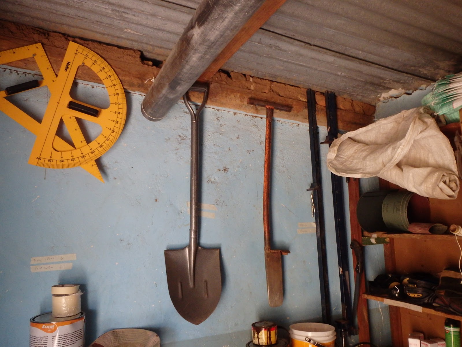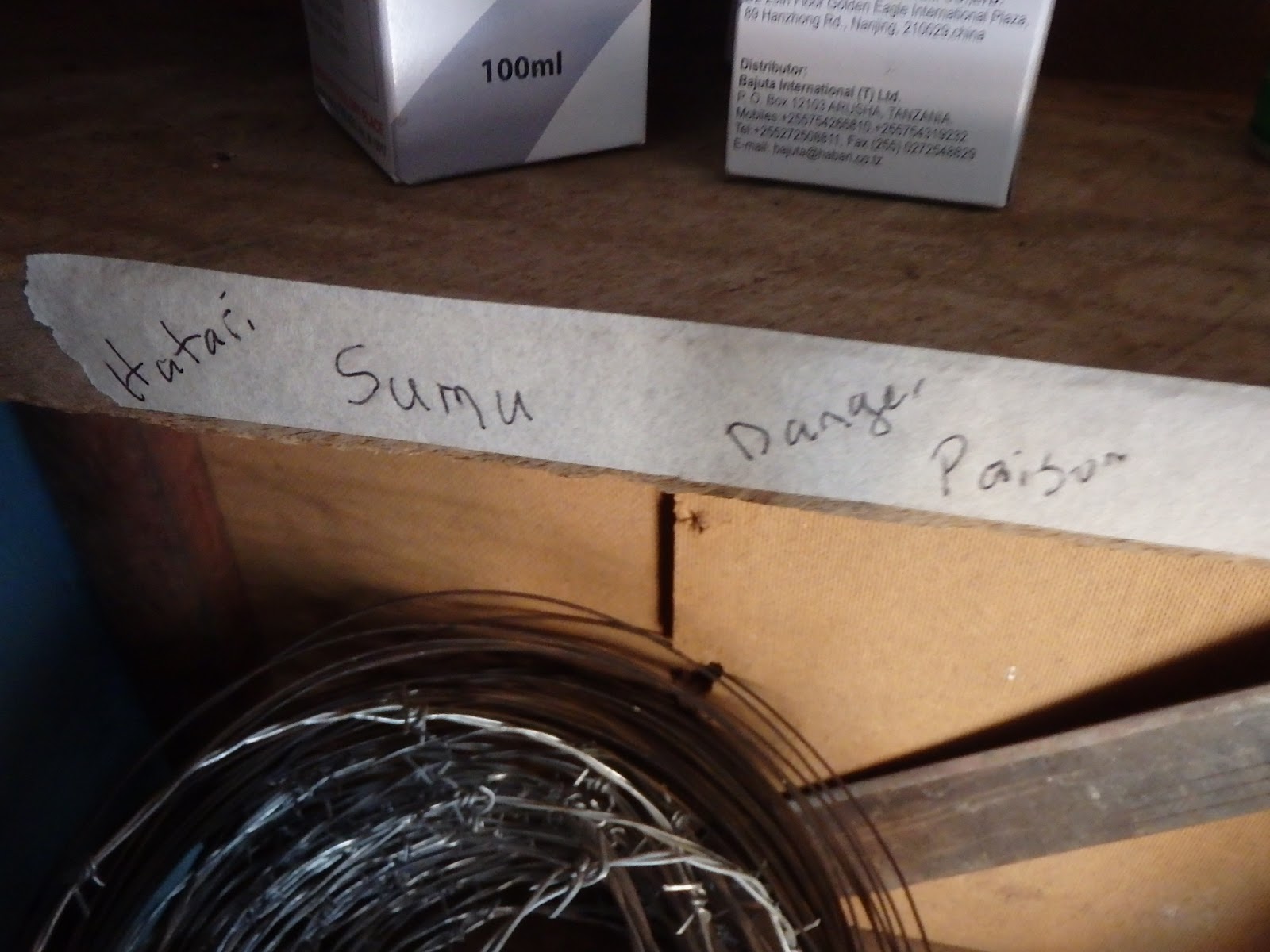 Over the next day and a half I inspected every tool as created a place for it in the new system. I inventoried all items remaining. I also packed up and moved to the trash pile a lot of items that keep showing up in the room that are broken, or never really had a good use. Now we have all our nails and screws in labeled jars instead of the paper boxes they are sold in. Not heavy cardboard like they are in the US but paper boxes that fall apart unless you pick them up with our hand on the bottom. All the paint is now organized by type and color with the partials on top and the full ones on bottom. We have an electric and plumbing section as well as Steve’s personal tools. These are the ones I brought over from my shop in the states. After cleaning everything for about the 5th time and spraying the bats that were causing the mess again, I went to labeling sections, tools like I had done with the nails and screws. Each item is labeled in English and Swahili. I did this as a practice for me to learn the Swahili but also so Isayah can try to learn some of the English if he wants to.