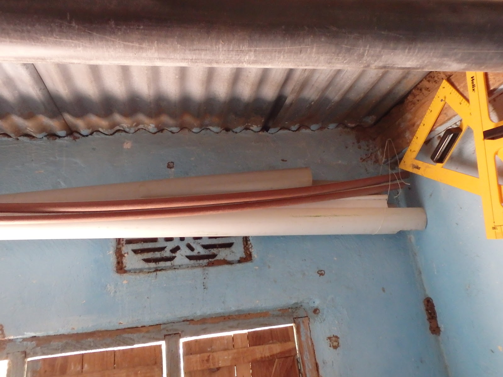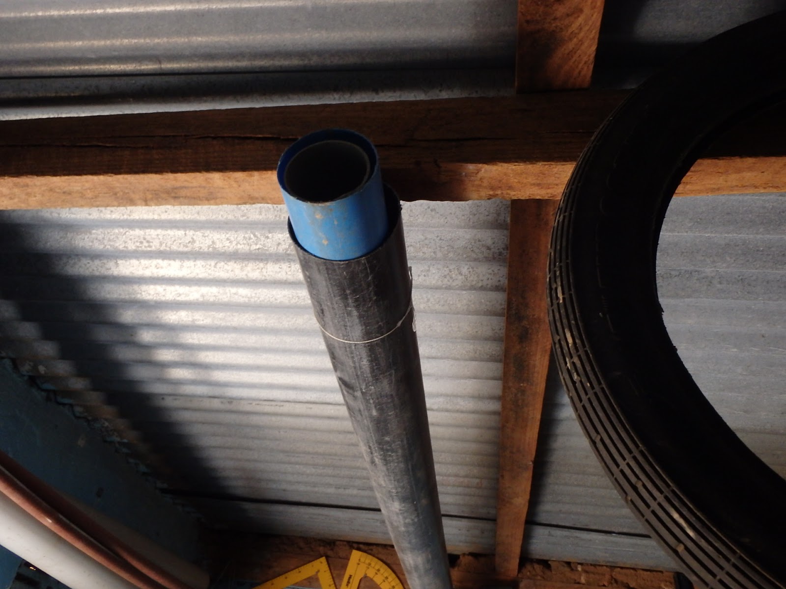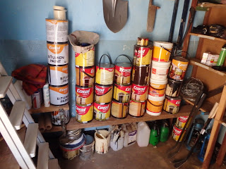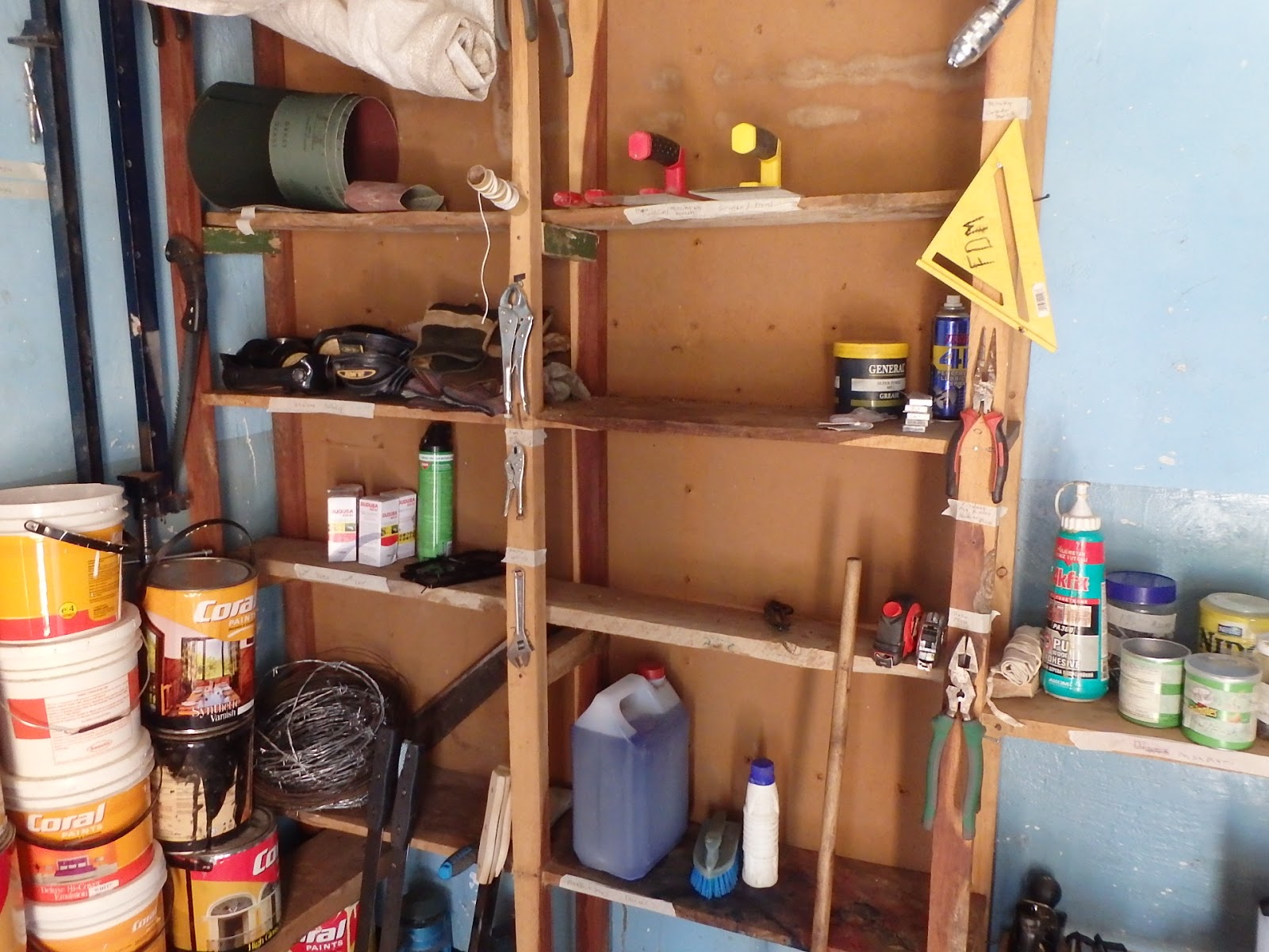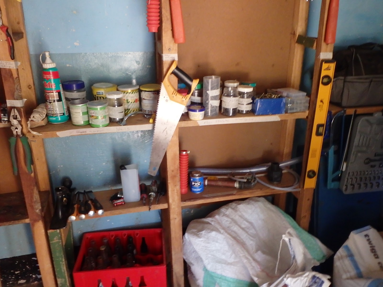 So I used the paint cans to make a couple of sets of shelves then went through some of the various items we had in wood and reinforced some of the existing shelving to be a little bit stronger. I took some of the left over guttering and pipes and used twine to create some slings to put store them off the ceiling. A second problem of using the mini-shop is the size of the room prevents me from storing our large ladders, full lengths of wood or pipe and the wheelbarrow inside.