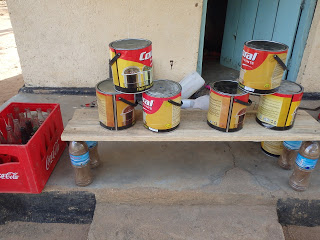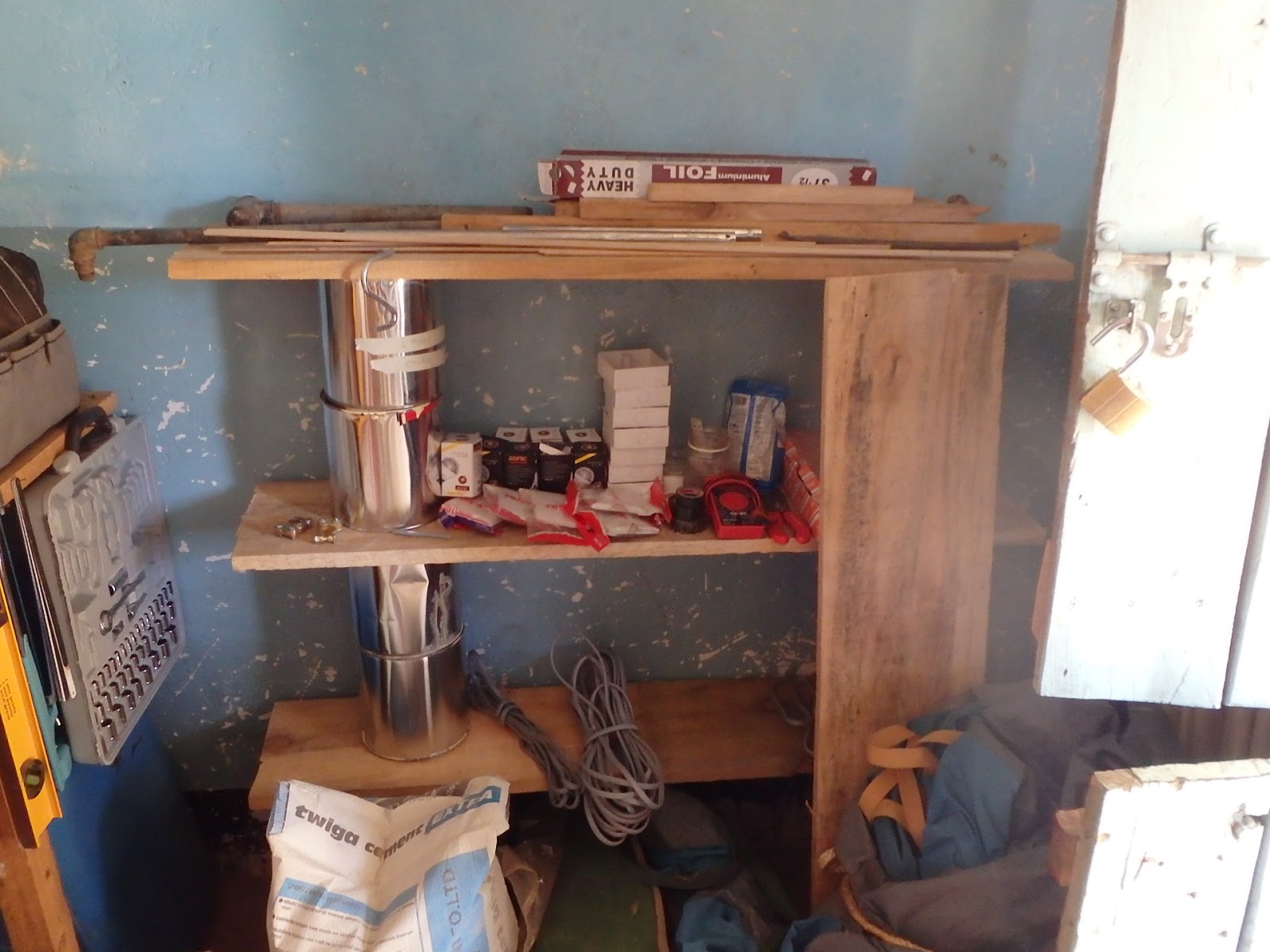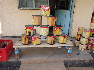 Something else I have a lot of is empty paint cans. For some reason it costs more to get a large container of paint than the equivalent amount in smaller cans. (cans are 4 liters and a large is 20 liters-one can cost 20,000 TSH but a 20 liter or (4liters * 5 cans) is 140,000 TSH which is more than what the 5 cans of 4 liters would cost). So end result is I have a lot of empty paint cans and we were planning on using them for William’s proposed tree nursery but since I have not actually gotten a proposal on that, I decided to use them for shelving. They are not the most attractive things even if I remove the labels since most have dents and they take up a fair amount of the shelving space, but they can hold a lot of weight. One shelf I made with a 2×6 about 8 feet long with 2 paint cans stacked on each end now holds all the paint we had and have just purchased for another project (18 full cans and another 5 with some amount in them).