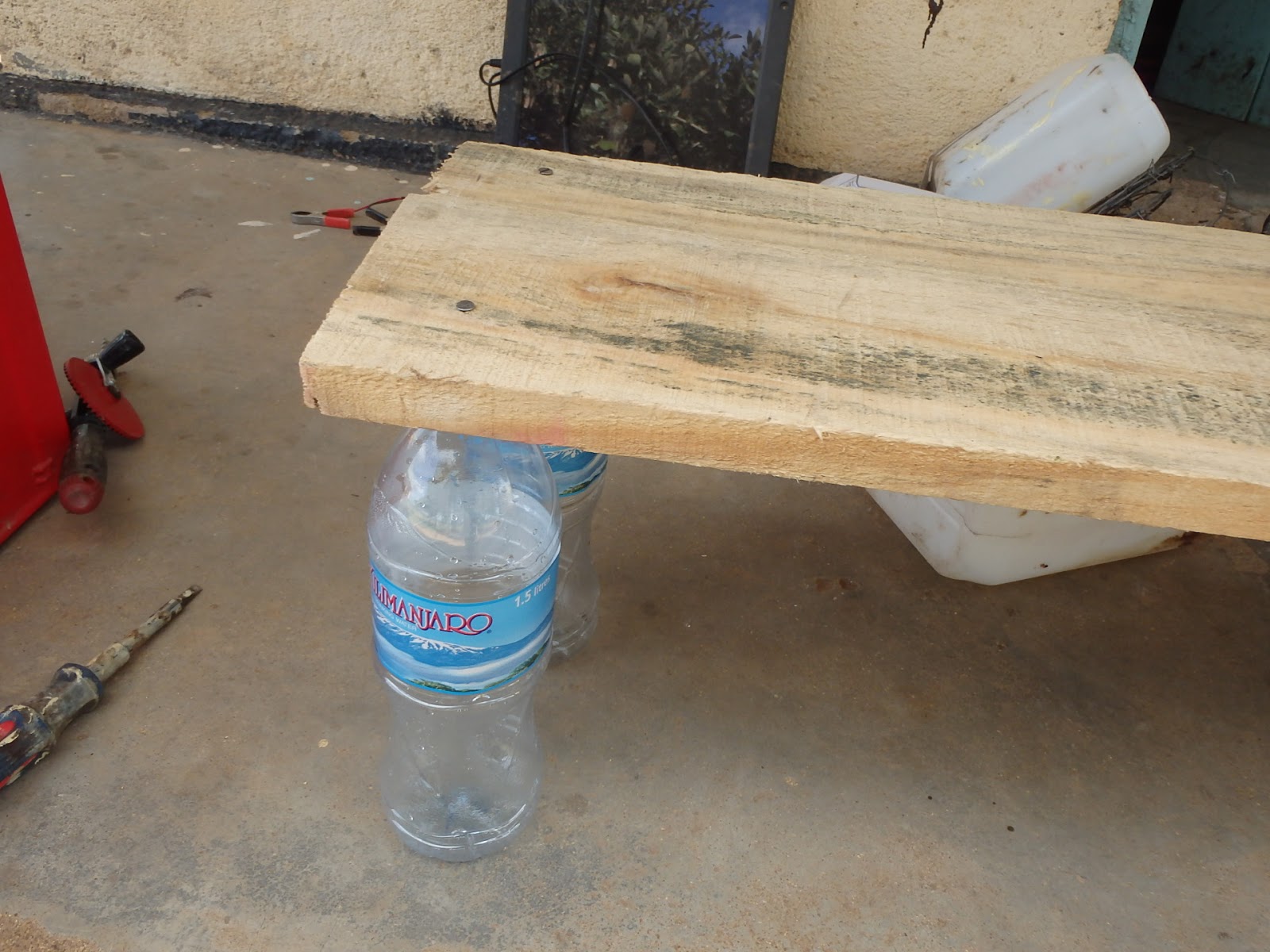 The first problem came when I could not find a drill bit in town large enough to get the spout part of the bottle into. In fact the largest I could find was ¼” which was not even close. The next time I am in Arusha I am sure I can find some but that does not help me now. So I decide to at least test the load limits of the bottle just balancing the shelf on them. Actually I screwed the bottle cap to the board to keep it from slipping. The first attempt would be with four empty bottles, a 1×10 board cut 4 feet long. This attempt held 6 full paint cans and one of the bottles collapsed with the addition of a 7th.