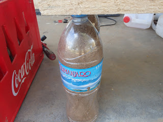 The next attempt would be with the bottles full of sand. This will add structural integrity by pushing out on the walls of the water bottle while the weight from tends to cause the weak spots in the bottle to collapse into the bottle. I could have used water but between it being a vital resource and the fact it would grow algae I did not it was a good choice. I left the bottle caps screwed to the board. This time I got 10 full paint cans (all I had to test with at the moment) on the board and the bottles were still holding. It was important to determine how much weight something like this can hold for determining how many shelves you stack on top of each other.