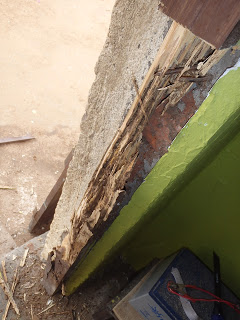 So first thing I had to do was cut out the rotten part of the frame, then cut a new piece of wood to go in it’s place as well as sand that wood down to size since it is slightly larger than the hole that exists. After I removed the rotten wood I noticed what caused this, the red mud bricks that make up most of the structure of my floor has been eaten out by various insects and critters that burrow because the bricks are the same as the ground. One of those insects happens to be termites which then devoured the wood as well.