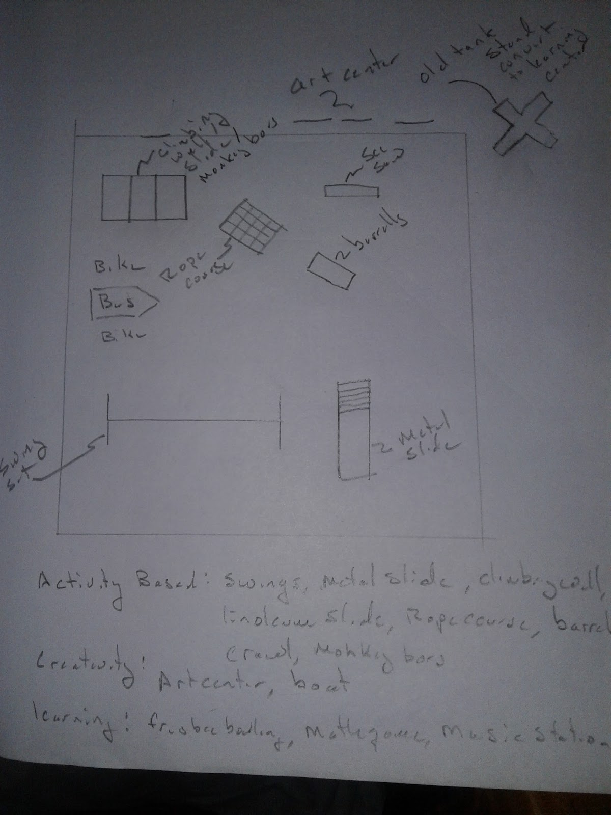| Overall sketch of the planned playground area. The border is the extent of the area with sand. This takes into account safety zones around high activity areas. Due to the low activity the imaginative play area may be moved outside the sand area. The future soccer field (small) will be to the left and the school is to the right. |