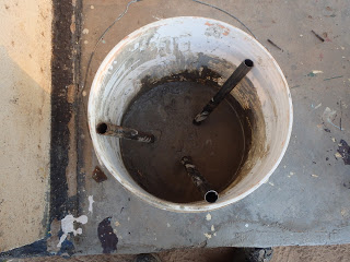 I used some of the extra concrete I had been mixing in a bucket to try an idea I have had for a while. Actually I saw a picture somebody did making a concrete stool using a 5 gallon bucket and some dowel rods. Here there are no dowel rods though I could have bought some plungers and used the wood from that but I have what is called furniture pipe. That is about 1/2 inch schedule 40 pipe (a little bit thinner wall than that but not schedule 20). So I cut 3 lengths that you then shove into the concrete near the center and lay it against the wall of the bucket giving it angle. Now I set this up on the porch of the tool room which no one is supposed to be around except Isayah and myself. He was off cutting grass on the other side of the property. Somehow the bucket got moved every time I went to do something else. So I am afraid the legs may have moved a bit before it set up enough. I will buy some bicycle handlebar grips to slide over the bottom of the furniture pipe to prevent damage to the floor of my house.