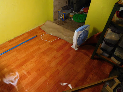While I had everything out of the house I also laid out my flooring I bought last year but could not get to. I want to get it flat but the only place to do that is in kitchen. It is a rolled linoleum product that looks like wood floors. Probably the least ostentatious rolled flooring product you can find in Tanzania.