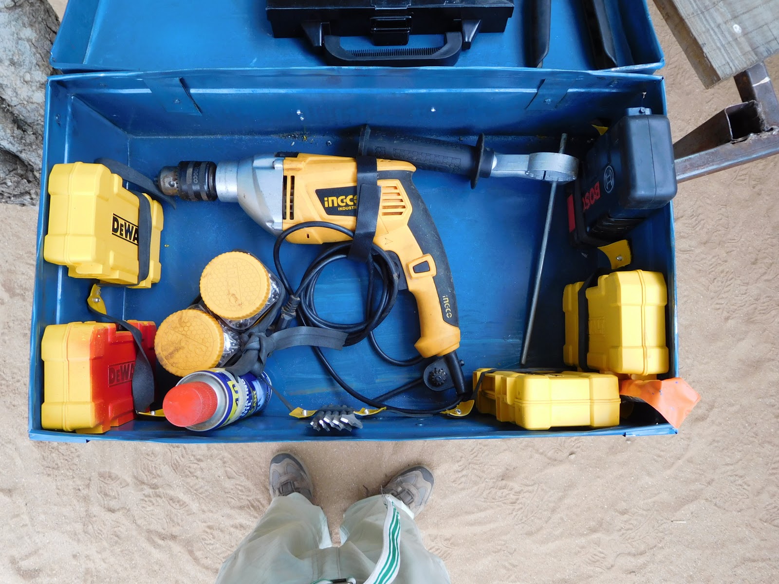 Yes those are my fingers poking through the bag. The next thing is to test the more readily available containers from Singida to see if my tools fit in them. The largest tool is the circular saw so it was the only one that would only fit in the metal box and not the plastic bucket. I could get a 5 gallon bucket for slightly more money to solve that problem but I decide to test out the box idea.