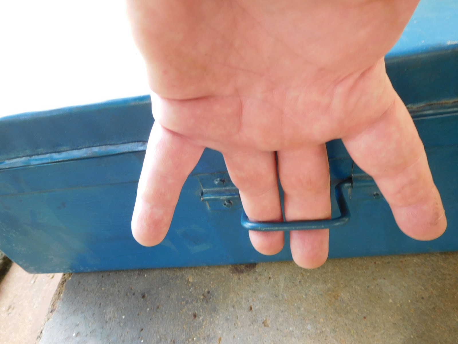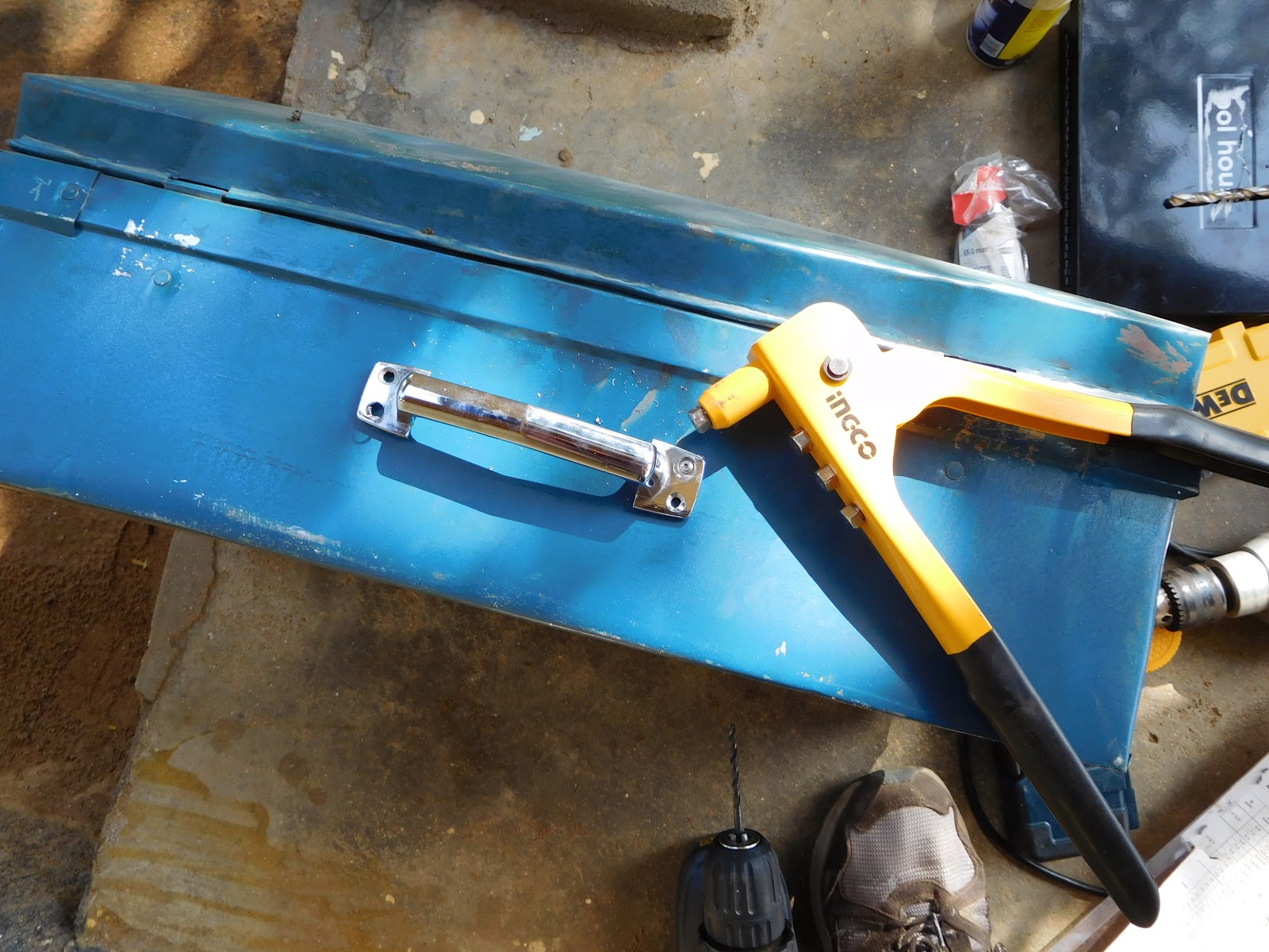 Some pros for the metal boxes include they are larger space wise and because they are not so deep it easier to get to items in them as opposed to the bucket where you may have to dig things out to get something on the bottom. The metal boxes will stack better because they have a wider more stable base and could actually be hung off the walls using the handle. Some problems include they are metal so they will get hot when out in the sun and when stacked they could rust at the corners where they touch and paint gets rubbed off. I can solve the rust problem by putting rubber strips along the edges, but they leave the boxes stacked for sale and they don’t have any rust so it may not be a big problem. The heat could be but they will mostly be used around the tool room so I am not sure how big of a problem it will be. A problem is seen in the picture below: the handle is too small but I can fix that by installing a door handle using rivets or buy the next size up. The next size up is the better solution as it only costs $0.80 more.