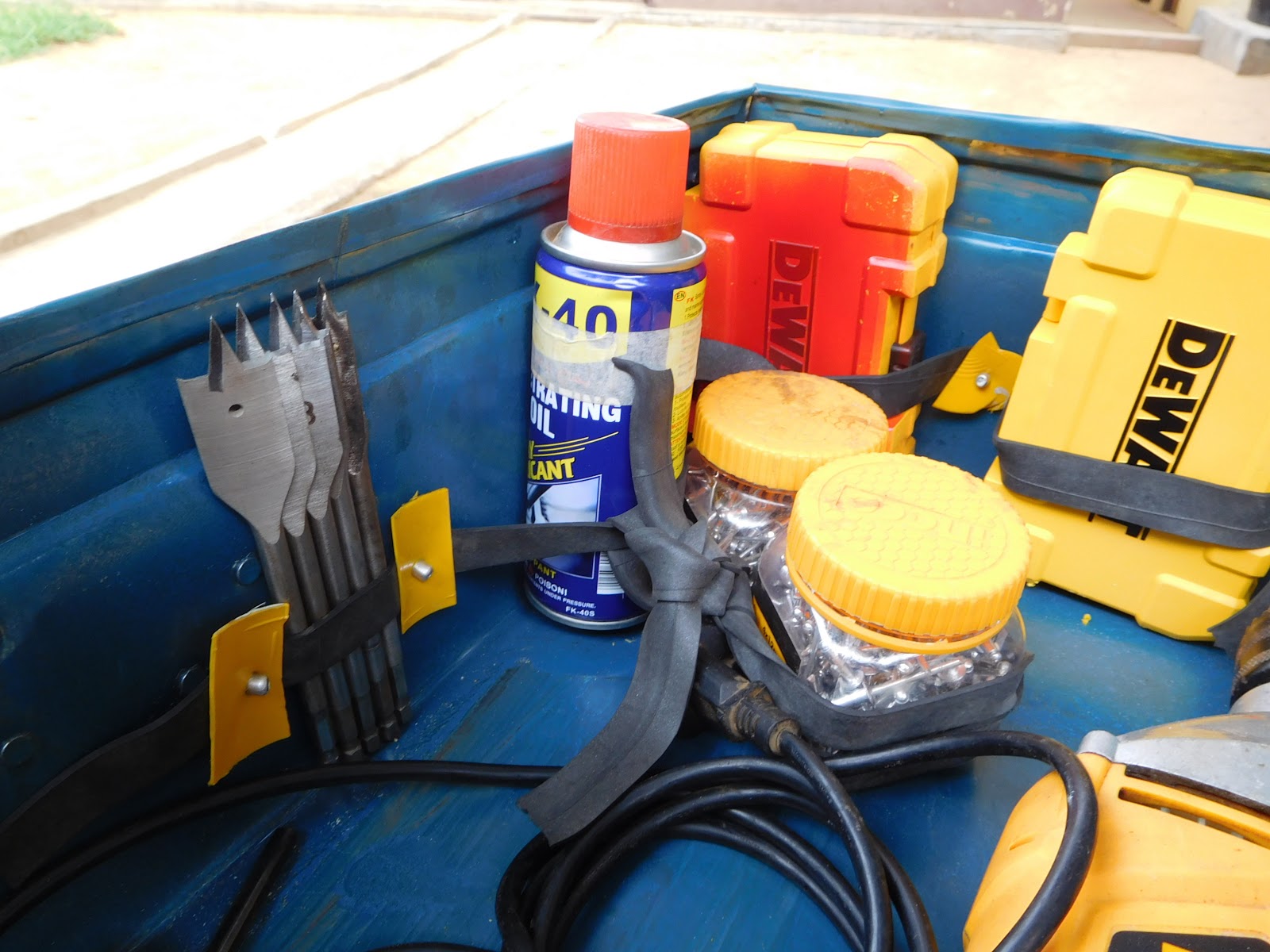 Next I use rubber straps that are available everywhere in Tanzania. They are used for strapping things down to pulling cars out of mud holes. They are cut from old inner tubes and really are not much good for heavy loads like strapping items on the rack of the truck because they will break as they normally do when they try to pull a vehicle with about 20 of them. It will work good for holding things in place after using the plastic pieces and rivets to form “slots” for items to be stored.