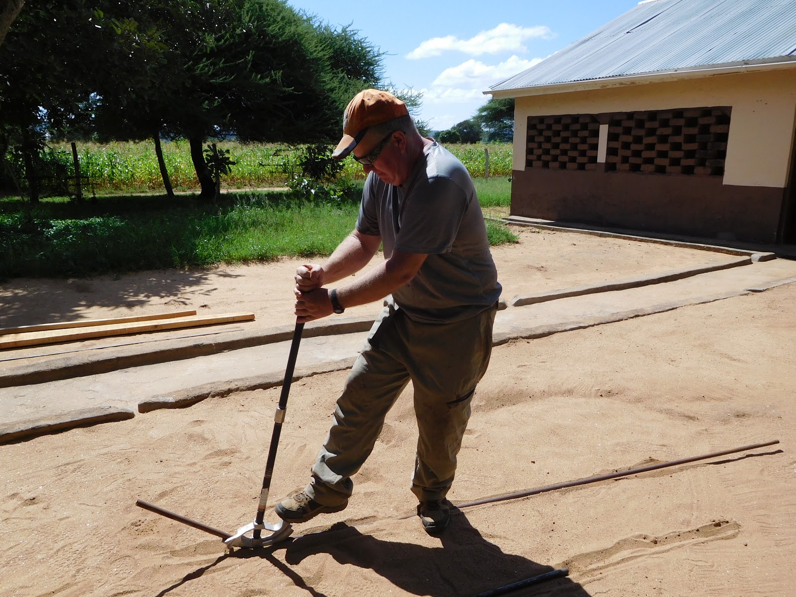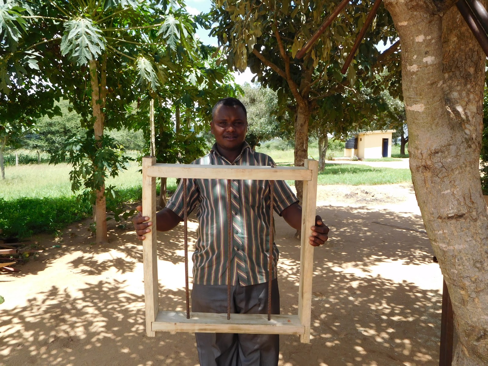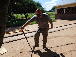 This last week was an interesting mix of items. I spent a lot of my week trying to get the site ready for my absence while I head home to the States awaiting my work/residence permit renewal process to be completed. But every time I started working on a project, one of the staff would bring something over and ask me to work on it. Most of the items were personal and not things belonging to the site. Most notable of those came from one of our nurses, Emmanuel. He wanted to build a window for his house out of the scrap wood I keep on site (never throw it away unless it is bad). I found it funny how he knew the piece of wood on top and bottom needed to be long enough to exceed the opening. This way they can put masonry grout between the bricks and the wood along the edges. What was funny was he had no idea how to figure out how long they should be. Understand this is someone who has done high school, the two extra years of high school and nurses college (probably a year or two extra here). But he could not figure out that you take the opening width add the width of BOTH boards on each side and then the amount you want it to extend on EACH side. When he finally caught on I was adding those things to his opening he only wanted add one side of the window and not both. What kind of math do they teach here? I walked him through building the window and how to drill the holes to put his “security bars” through. Again, he wanted to cut them the exact width of the opening (inside of the opening) and I had to explain they had to be long enough to extend into the wood on both sides. He finally gave up at this point and I did the measurement for him and showed him how to drill both sides and slide it through. Here he is with his completed window.