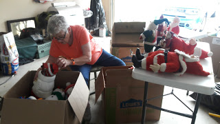 | Mom deciding what Christmas Santa Clauses stay and which go to yard sale. |