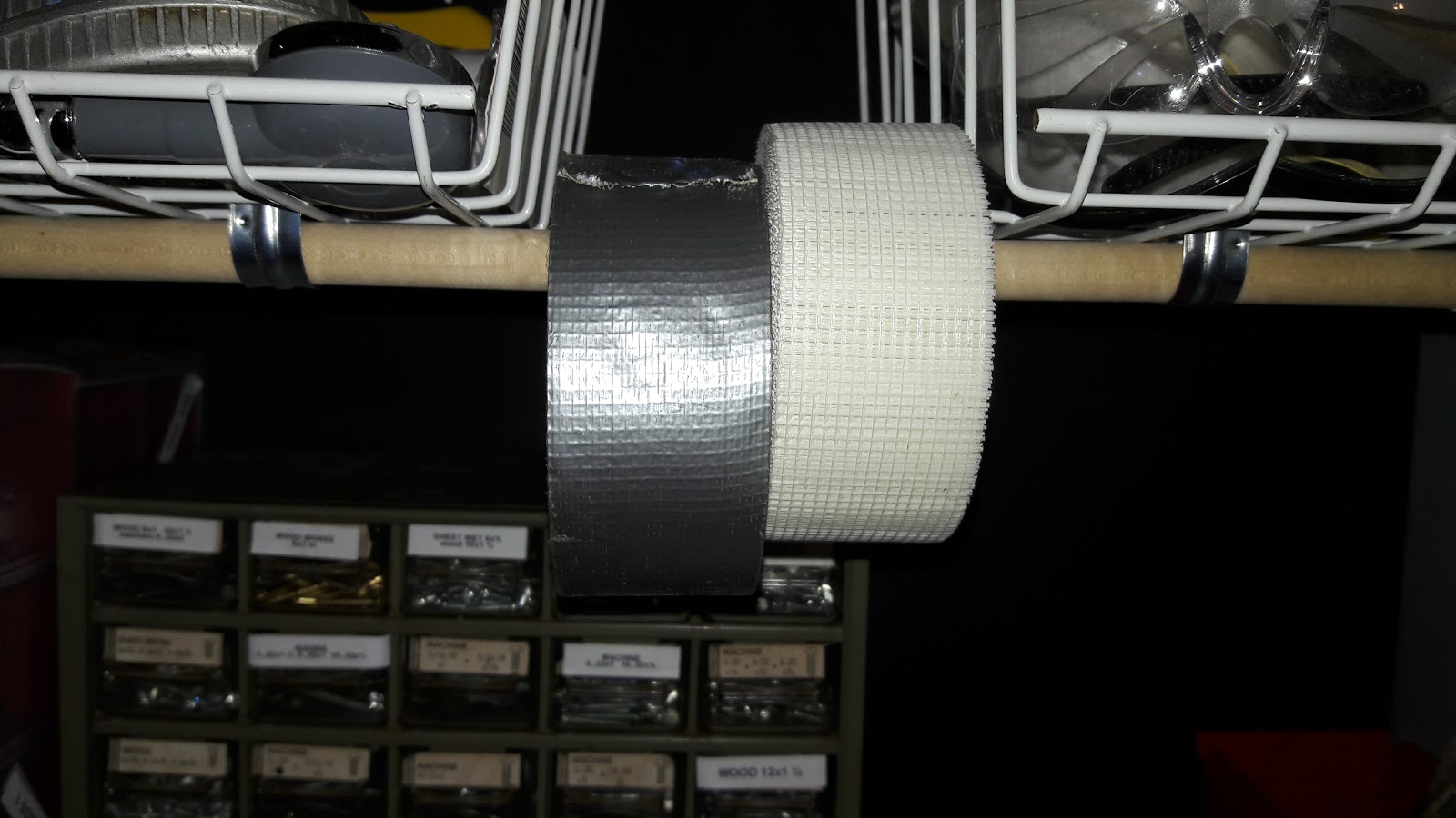 | I took two loose pipe mounting brackets lying around and a piece of dowel to make the tape dispenser |