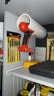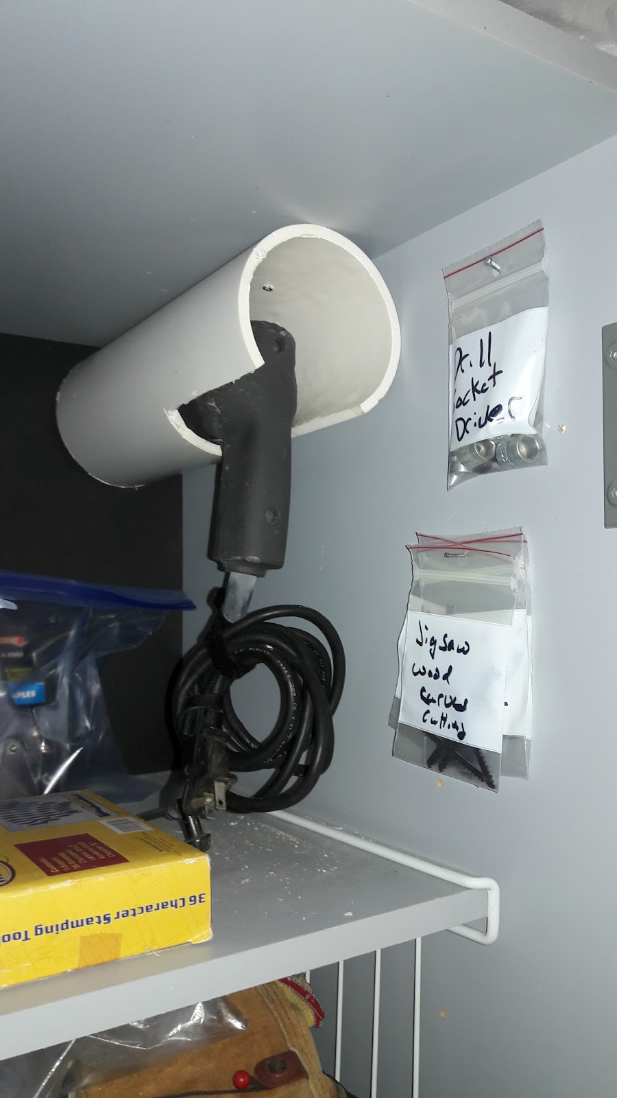 | That is a piece of 3″ PVC pipe cut to hold the drills up and then old asbestos sampling bags with the loose driver bits and jigsaw blades |