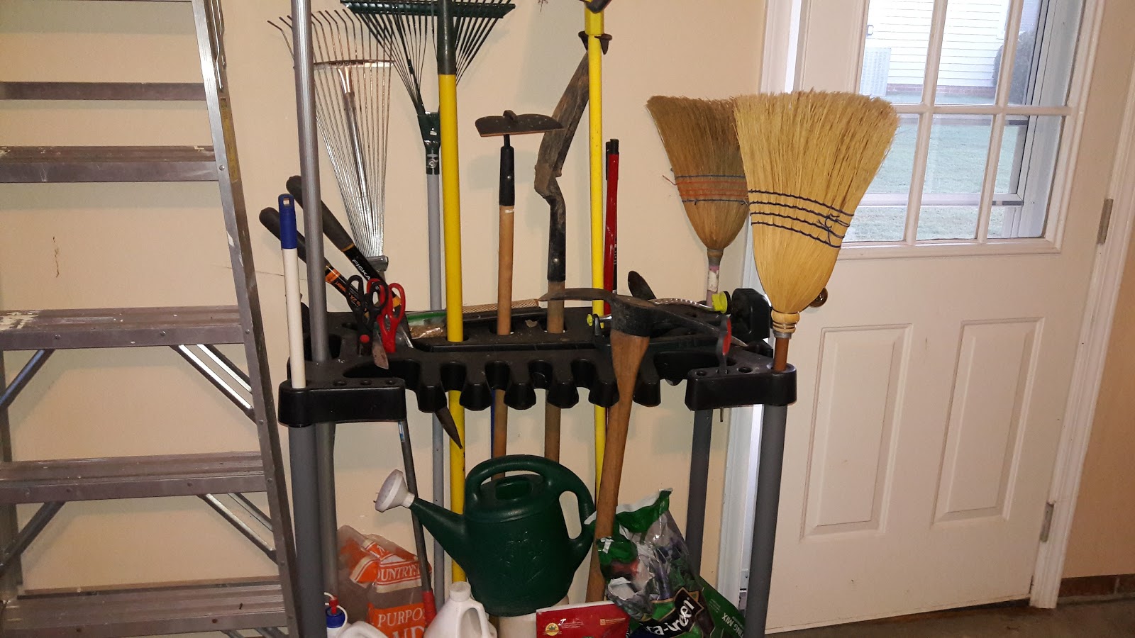 | all the garden tools put back in a place. |