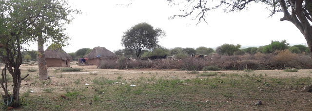 | two traditional mud hut style homes with a thorn bush corral for the cattle which are the white and black spots in the center of the photograph |