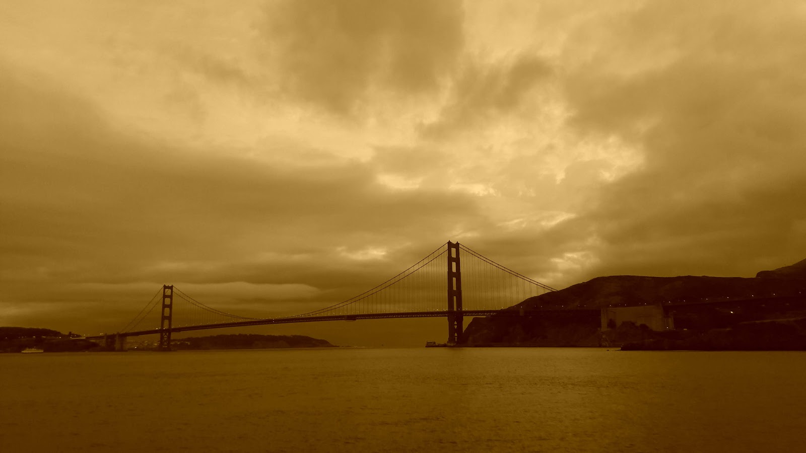 | the iconic Golden Gate bridge near sunset on a cloudy day using sepia mode |