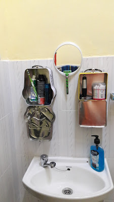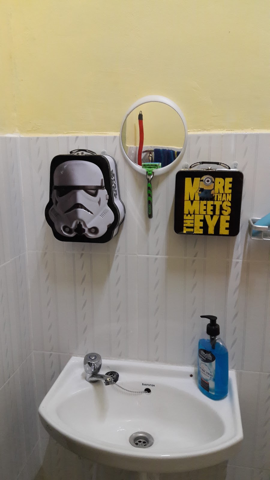 Over the sink I installed a Command Strips mirror that also holds your shaving razor that I had the good fortune to come across in the States. On each side of the mirror I installed metal lunch boxes to hold personal toiletry items. The larger one, the stormtrooper, holds my toothbrush, toothpaste, deodorant, and shaving cream. The smaller one, the minion, holds my stray hair clipper, nail clippers and cotton swabs. I got this idea when I saw a Pintrest post of someone turning an old suitcase into a medicine cabinet. My needs were much smaller so I decided to use the metal lunch boxes instead. I used Command Strips to attach them to the walls and it has worked great for the first 3 weeks.