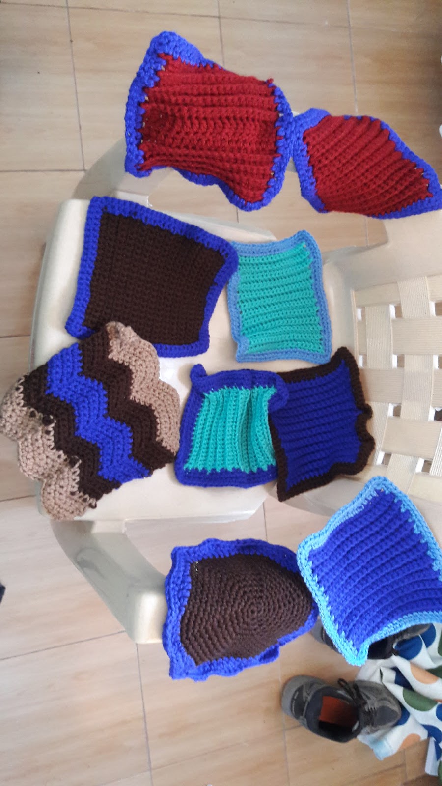 However a potential program popped up on the radar last weekend that would need a washcloth for each of our students, so instead of going and spending almost no money to buy those, I came up with the bright idea I could make them. So far I have done 3 basic types: ribbed rectangle with alternate color border, round with a fancy alternate color border, and the zig zag stripe pattern (I have never actually done this until now). So far I have 11 made. 39 more to go, though one of the teachers is planning to make a couple to help me out.