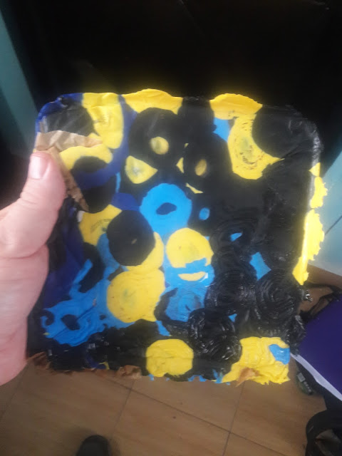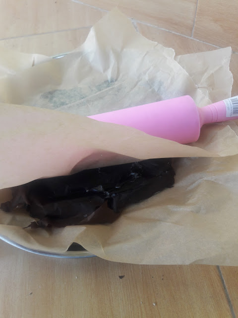 | I used a baking sheet under the plastic to keep it from sticking to my pan. This technically worked but the paper stuck to the plastic. More on this in a second. |