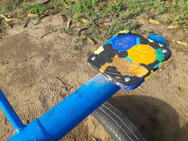 Now why did I make this. We had a seat on the see saw break-cheap wood lined up the wrong way (cheap wood is all that is available here despite what it costs and yes I am a wood and steel snob sometimes but I like things that work). So off to install it on the see saw. Fortunately (the only time I got to use this version of that word in the blog) it fit over the two pieces of metal and four bolt holes nicely even if it was a little small.