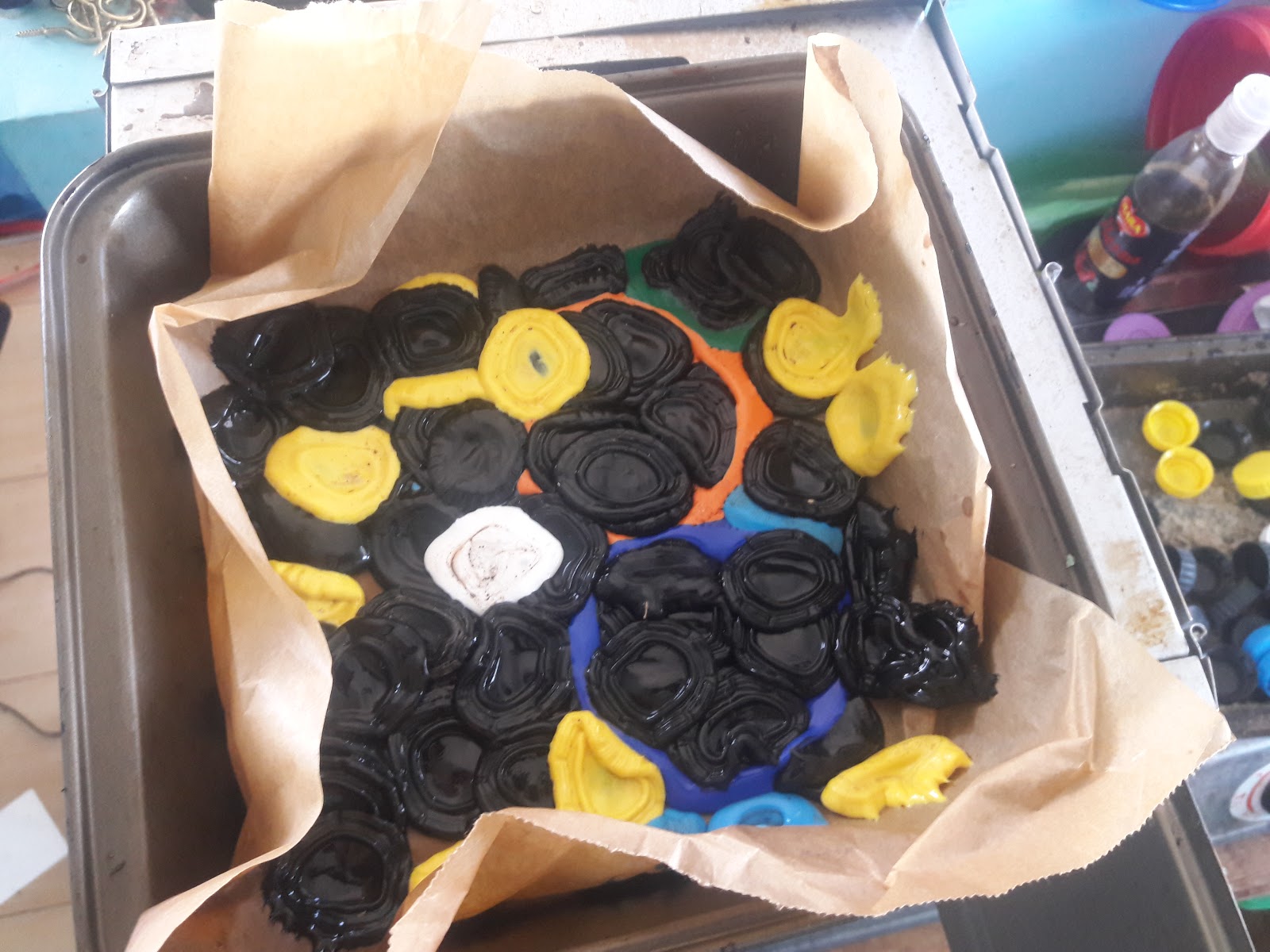 The bottle caps almost looked like an abstract art project…
