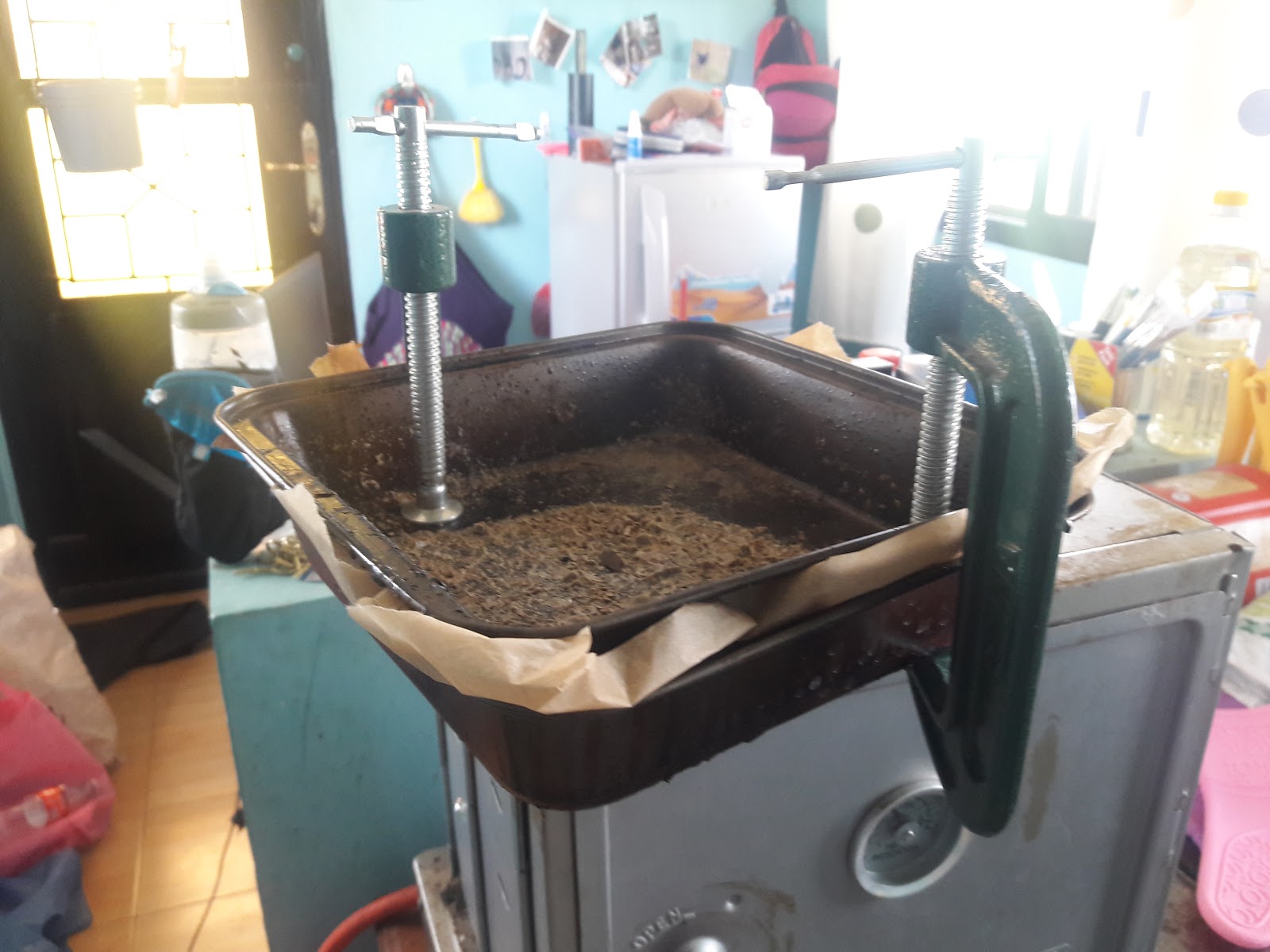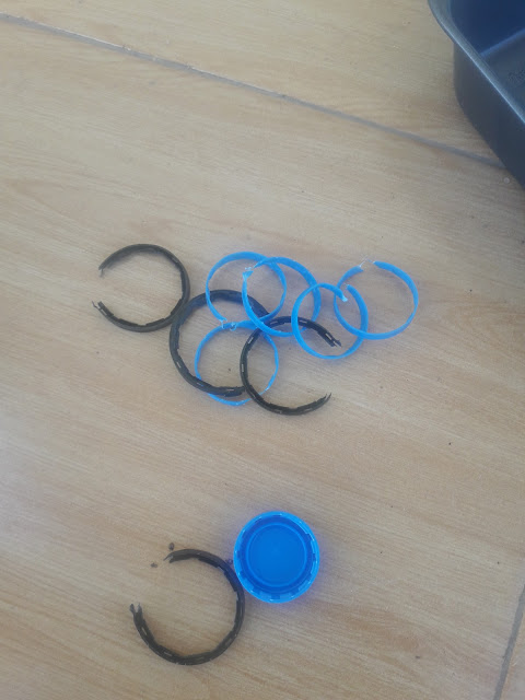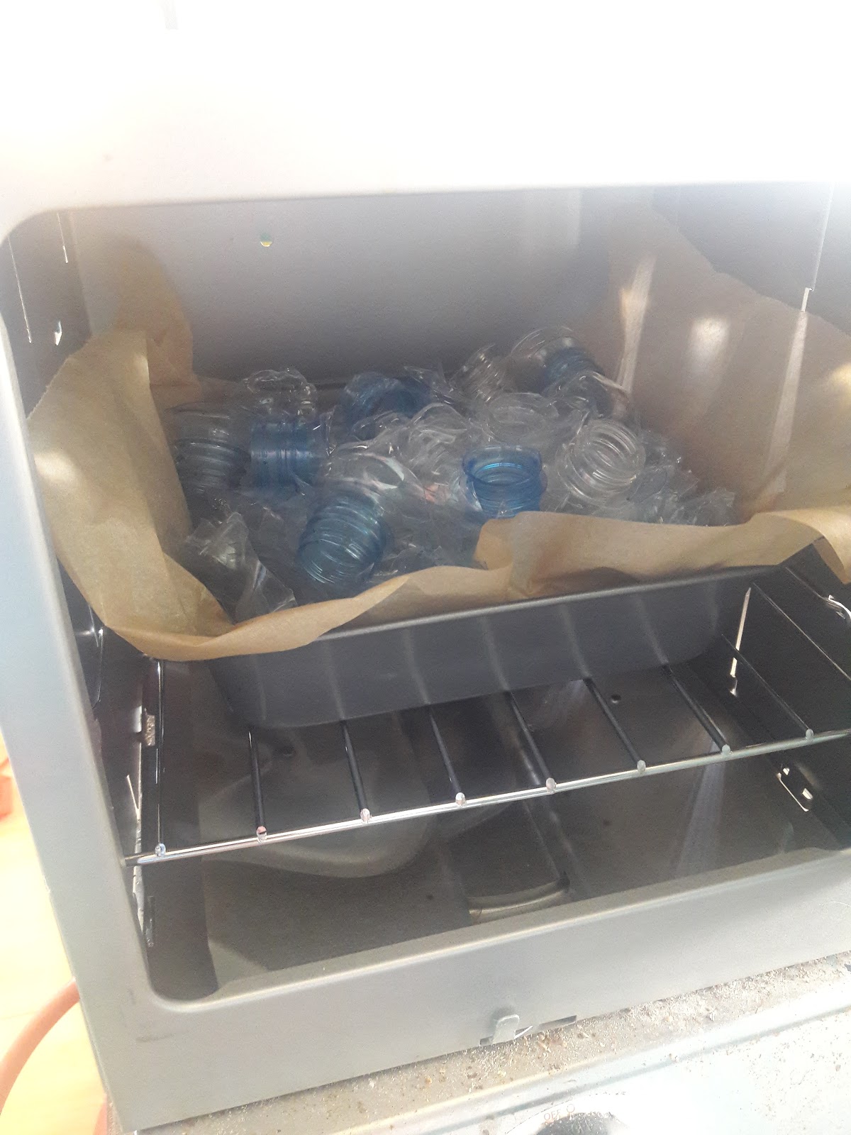 After the PET limited success, I switched to the HDPE or #2 plastic which is mostly lids on water/soda bottles but also shampoo bottles and some oil bottles. It is also the plastic the large plastic coffee containers are made from but those are better being reused. HDPE turns soft at around 300 degrees Fahrenheit and if you keep at the lower temperatures it does not break down fumes are not an issues. This also means I get to use the baking sheets. It also does not become brittle when cooling off and becoming solid again.