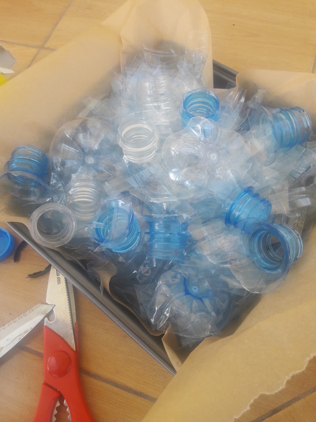 I had to start with collecting the bottles. This is easier than when I did it to reuse them as bricks in construction. That collection had to be all the same size bottles and all in decent condition. This time any plastic bottle that was a 1 inside the recycle triangle would do and it could have been crushed, dirty reused until it was worthless (sort of). After that I had to remove the labels, bottle caps and the retainer ring of the cap. I decided to cut them up into small pieces (relatively) before I washed them. Next time I will try the other way to see which is better, but I think this was the right choice.