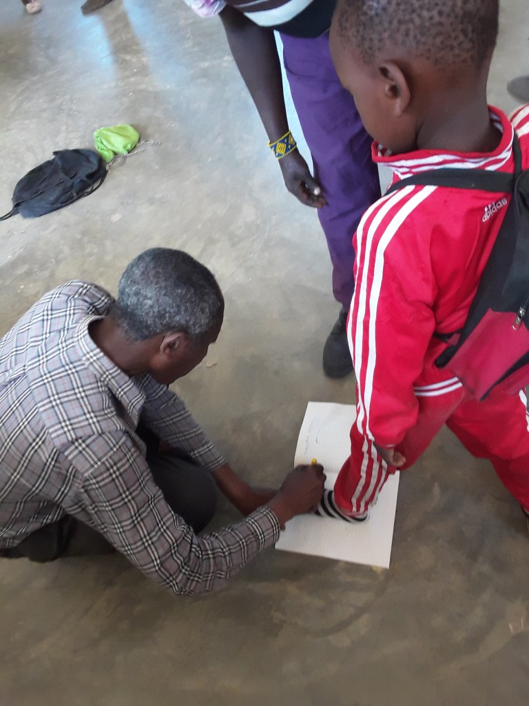 In addition to the uniforms, we found a group in Moshi who made our school shoes. Yes you read that correctly, they made our school shoes. At first, I though he would shoe up with a bunch of shoes already made and fit our students with them. But I forgot about the Tanzanian belief of never doing anything beforehand. So he came to our school with an exercise book and on each page he wrote the name of the student and then drew an outline of their foot. Three or four months later he showed back up with the shoes all made.