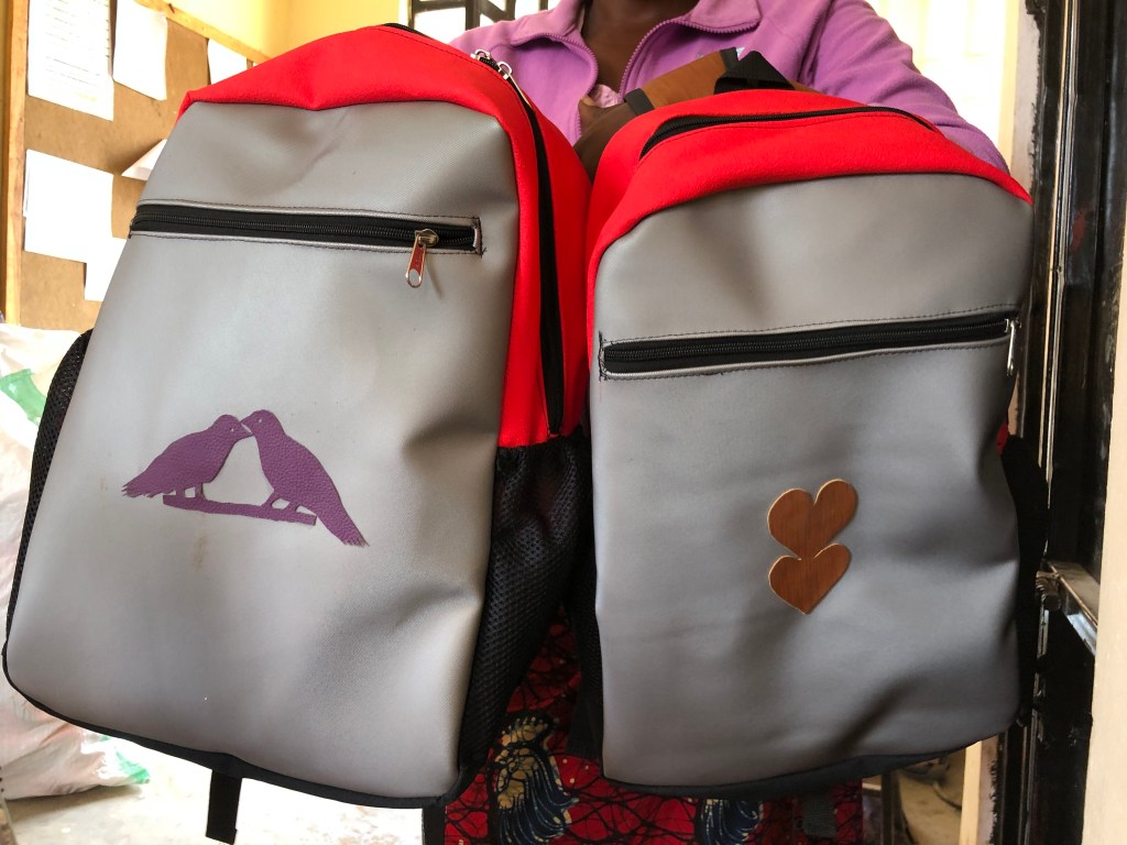 Earlier this year I was introduced to a lady in the nearby village who makes book bags in different sizes out of a pleather type material. I got her to visit and was impressed with the quality of her work. So I set a contract for her to supply all the book bags we need for Christmas gifts. There were two big benefits from this contract. First without paying anymore, I no longer have to assemble the bookbags myself. She delivers them assembled and tested. Secondly she agreed to add some personalization to each bag, something small to help the students tell their bags apart.
