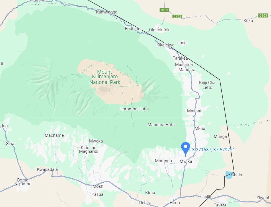 In this blog I am going to talk a bit about Blessed2BlessU Ministries, Inc. providing and installing 2 new pieces off playground equipment for the preschool students at Mwiko Integrity School. This is the same school and orphanage that Blessed2BlessU Ministries, Inc. provided and paid to install water piping to last year. This school is located near Mt. Kilimanjaro and is at a steep elevation with very rocky terrain. A location map is below. Tumaini Evangelistic Pre & Primary School is located roughly 3 hours below going through Moshi.