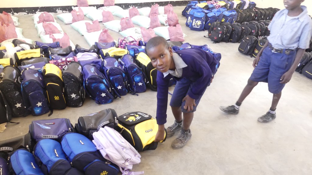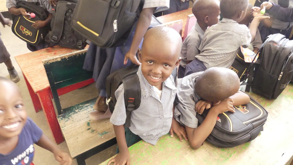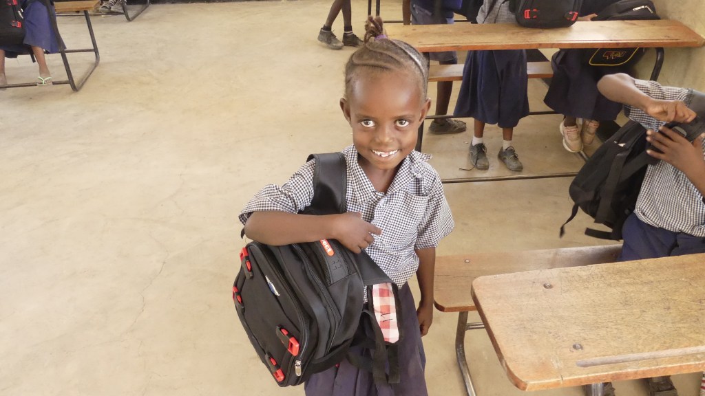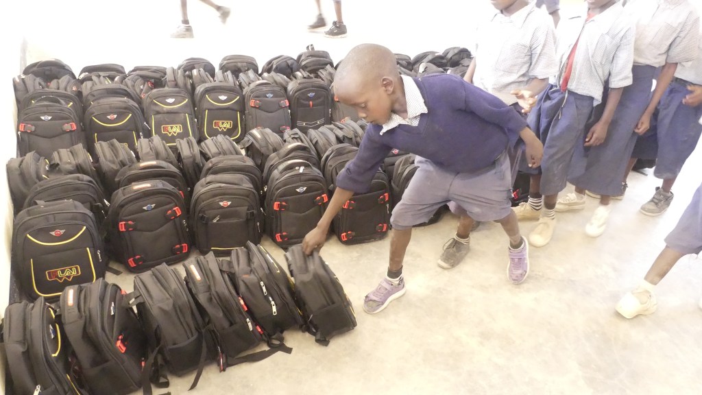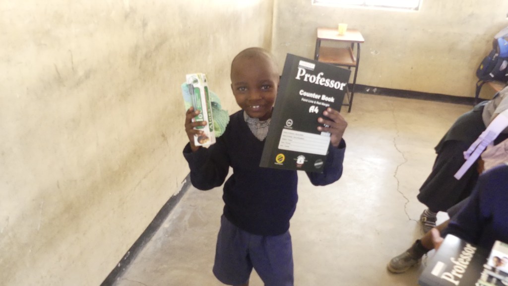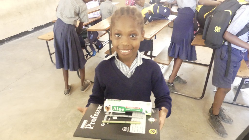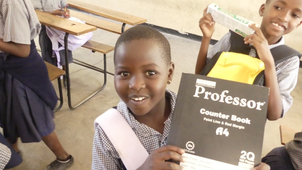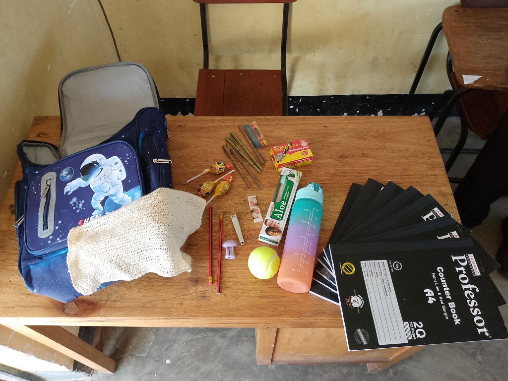 The bag above is what each student is given. The only differences is that preschool students get smaller bags and smaller notebooks but also a coloring book to go with their crayons. Standard 3 students also get a Bible with their bookbags. In case you cannot tell what all the items are there are exercise books, water bottle, balls (tennis or foam depending on age), toothpaste, toothbrush, soap, erasers, pencil sharpener, pencils, pens fingernail clippers, crayon 4 packs, suckers, crochet clothes and a book bag.