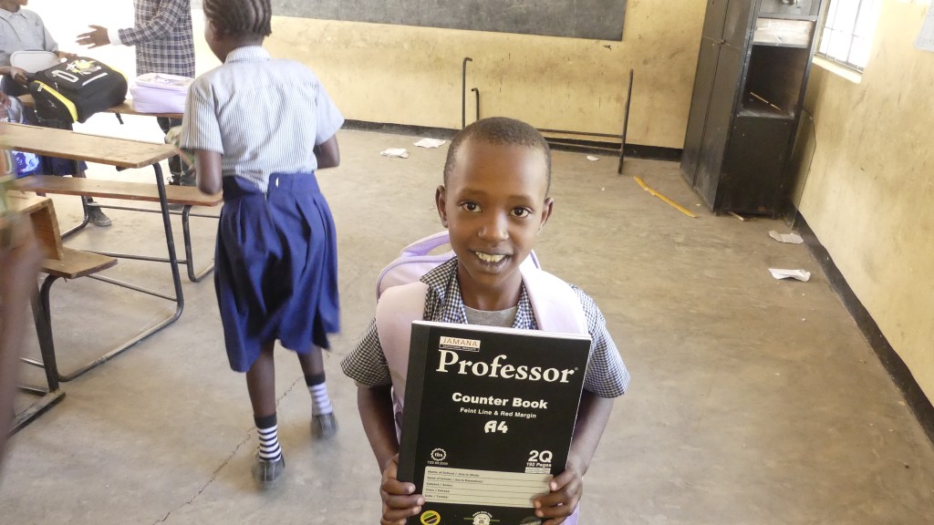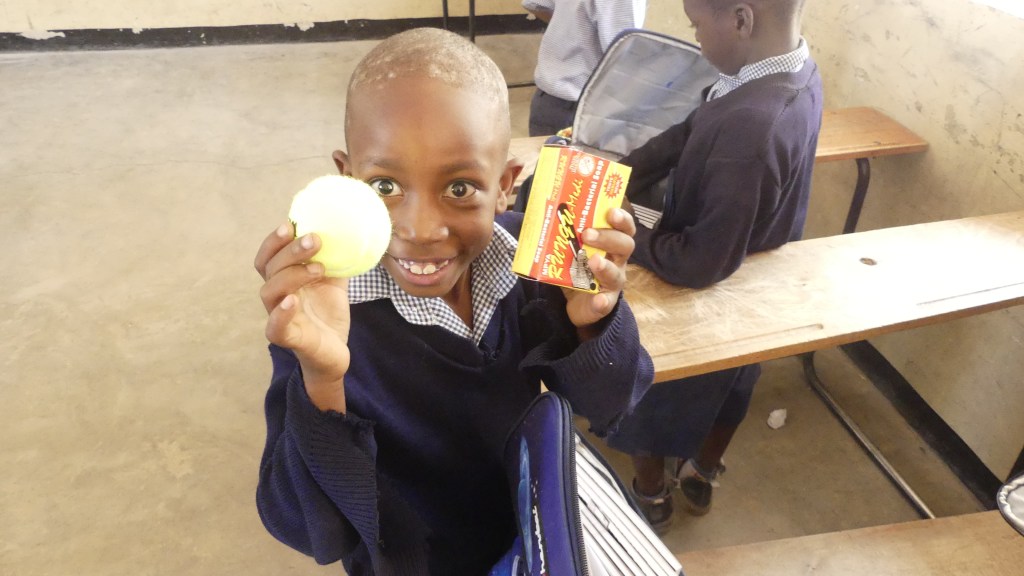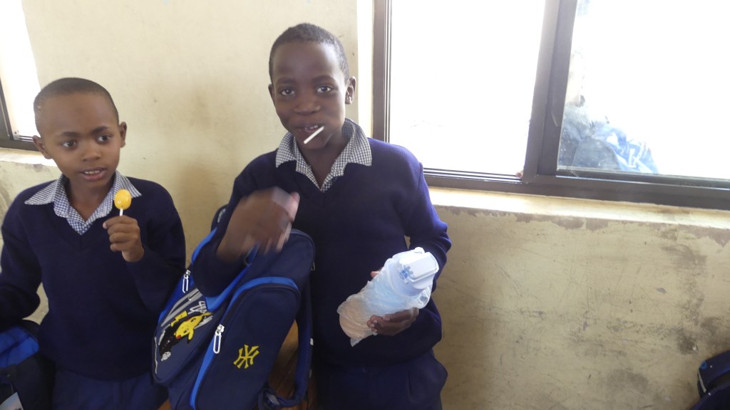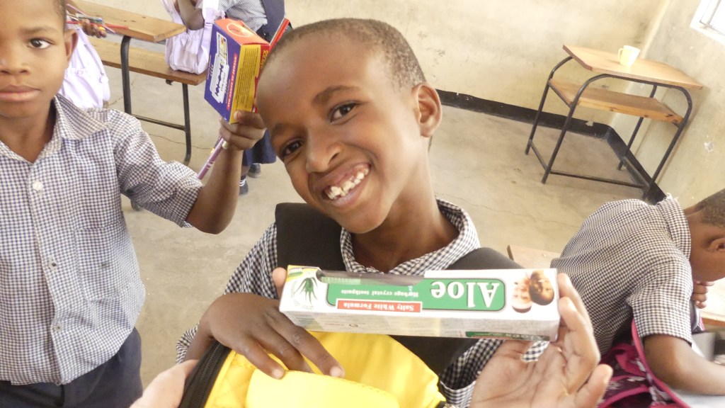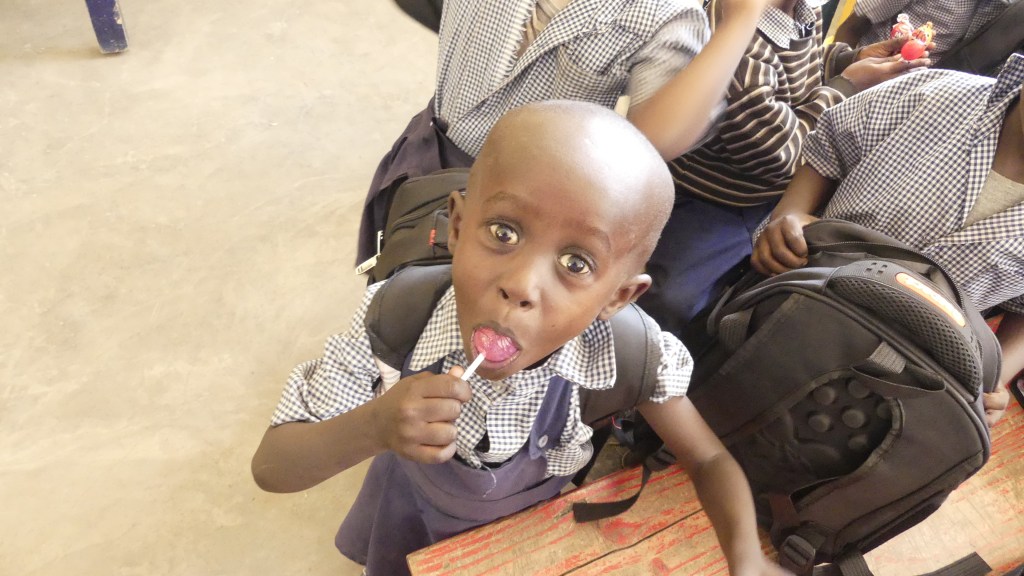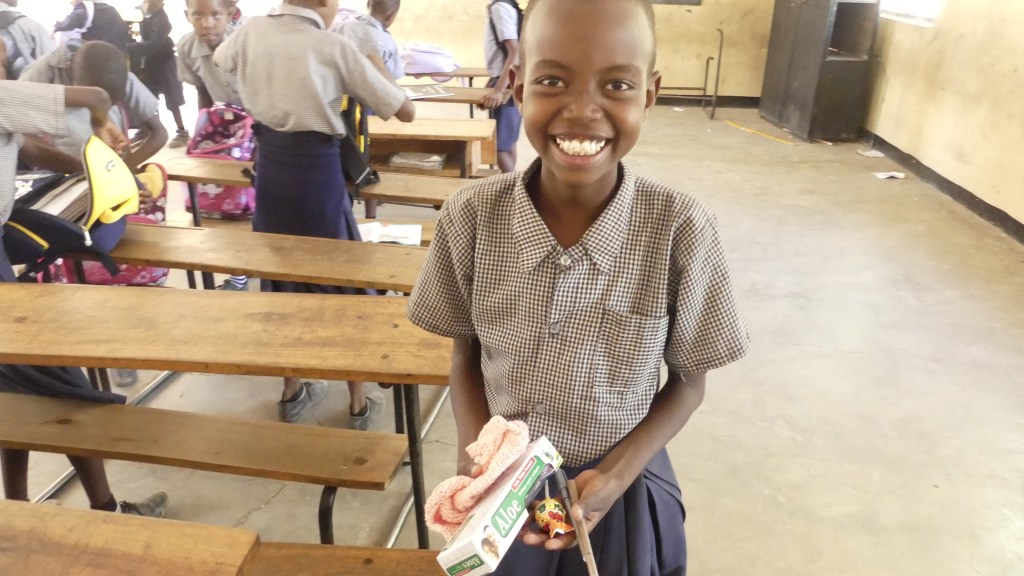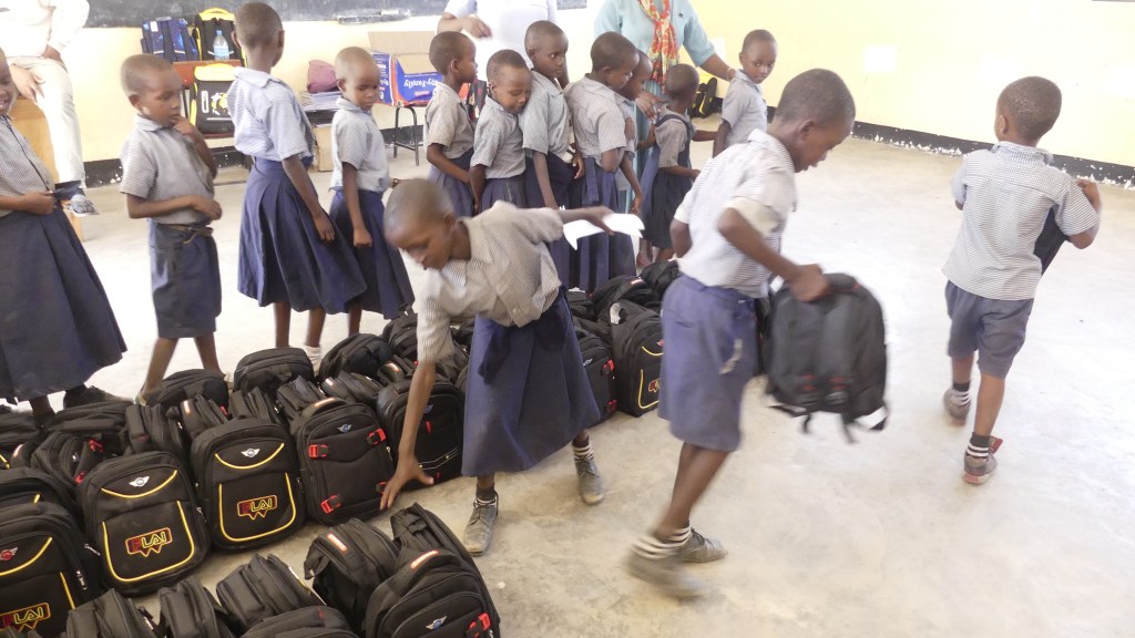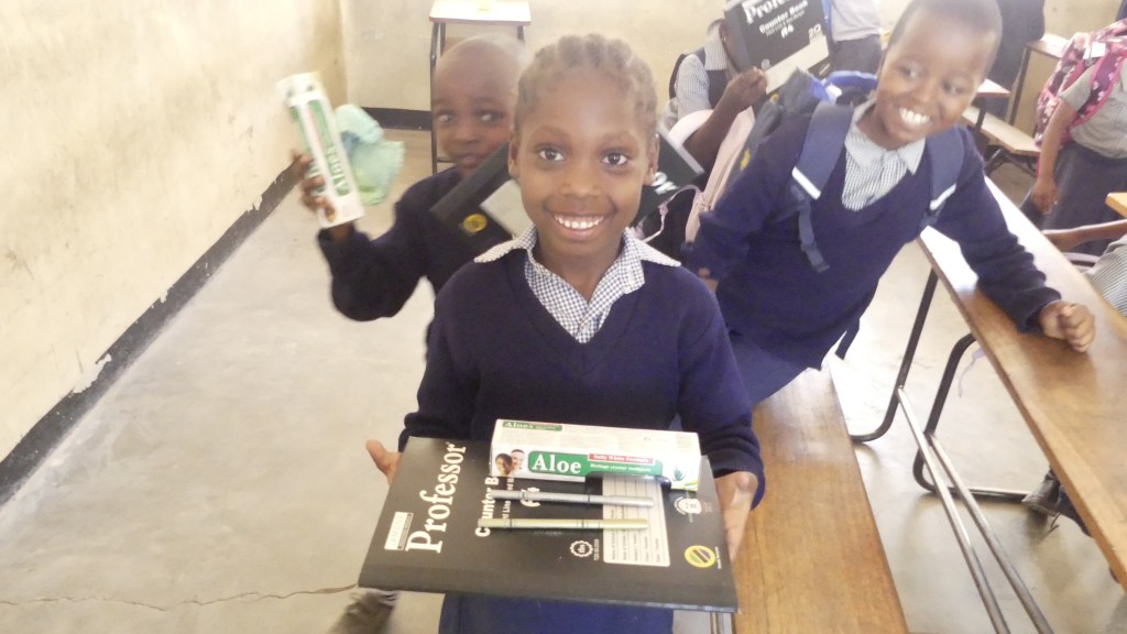The bag above is what each student is given. The only differences is that preschool students get smaller bags and smaller notebooks but also a coloring book to go with their crayons. Standard 3 students also get a Bible with their bookbags. In case you cannot tell what all the items are there are exercise books, water bottle, balls (tennis or foam depending on age), toothpaste, toothbrush, soap, erasers, pencil sharpener, pencils, pens fingernail clippers, crayon 4 packs, suckers, crochet clothes and a book bag.