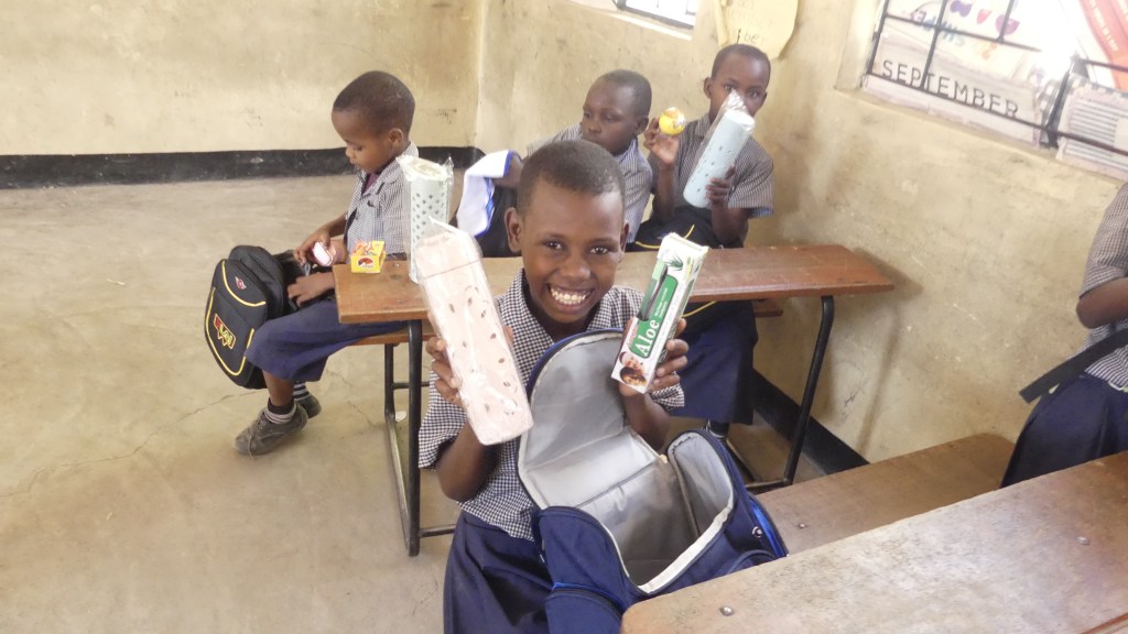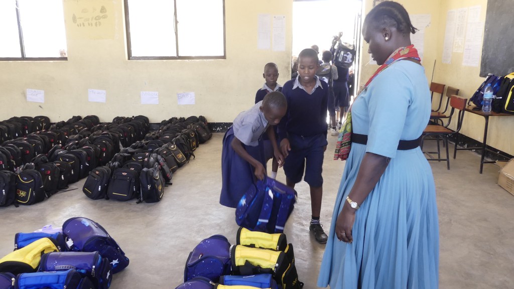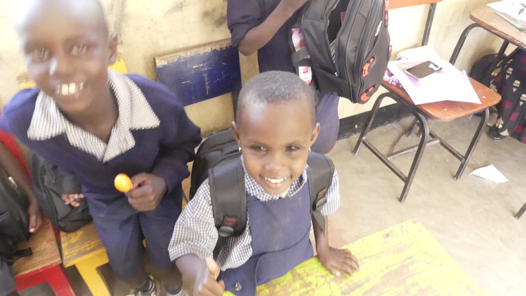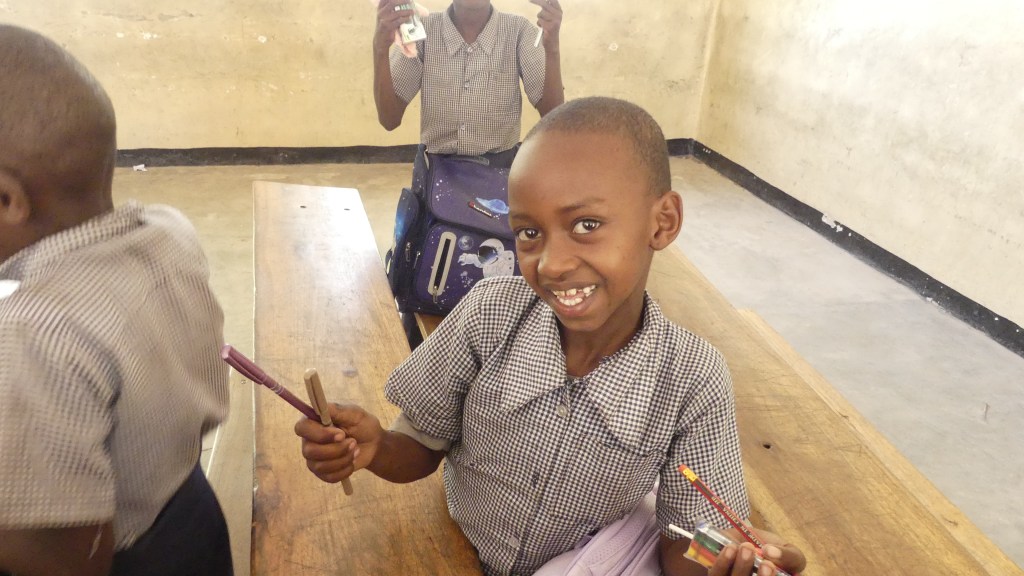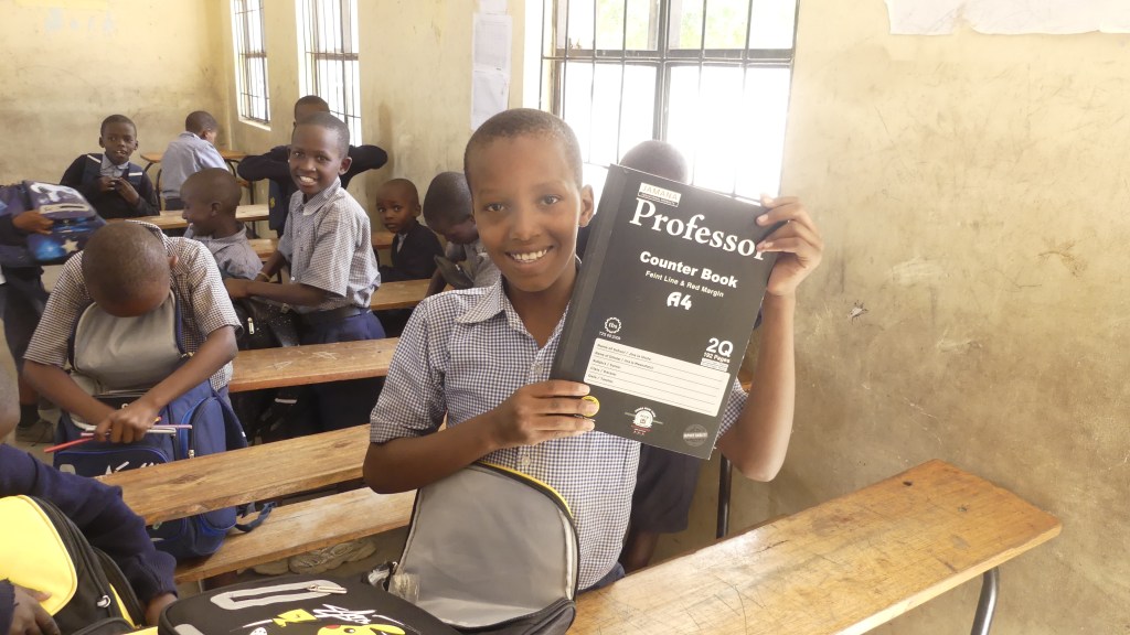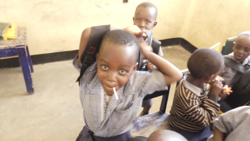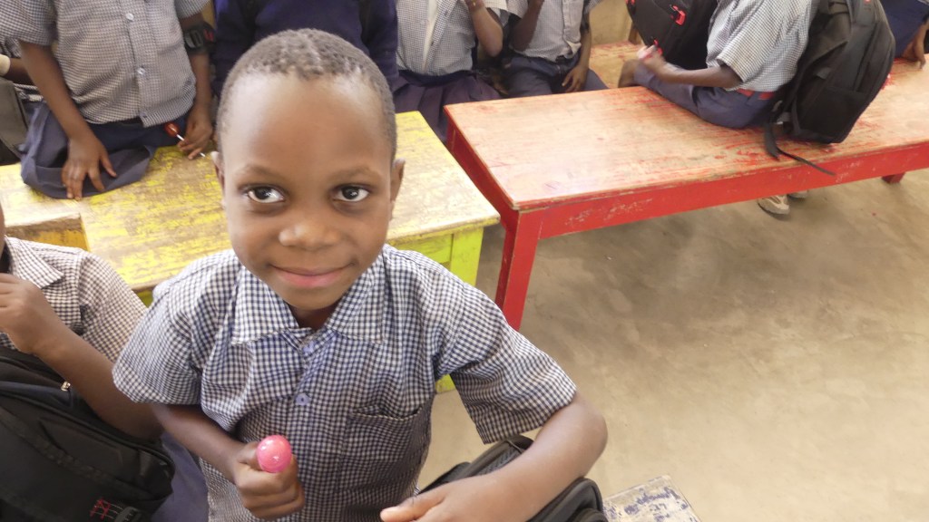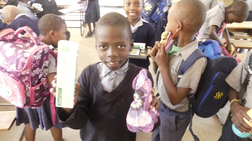 The bag above is what each student is given. The only differences is that preschool students get smaller bags and smaller notebooks but also a coloring book to go with their crayons. Standard 3 students also get a Bible with their bookbags. In case you cannot tell what all the items are there are exercise books, water bottle, balls (tennis or foam depending on age), toothpaste, toothbrush, soap, erasers, pencil sharpener, pencils, pens fingernail clippers, crayon 4 packs, suckers, crochet clothes and a book bag.