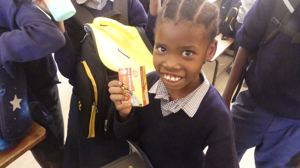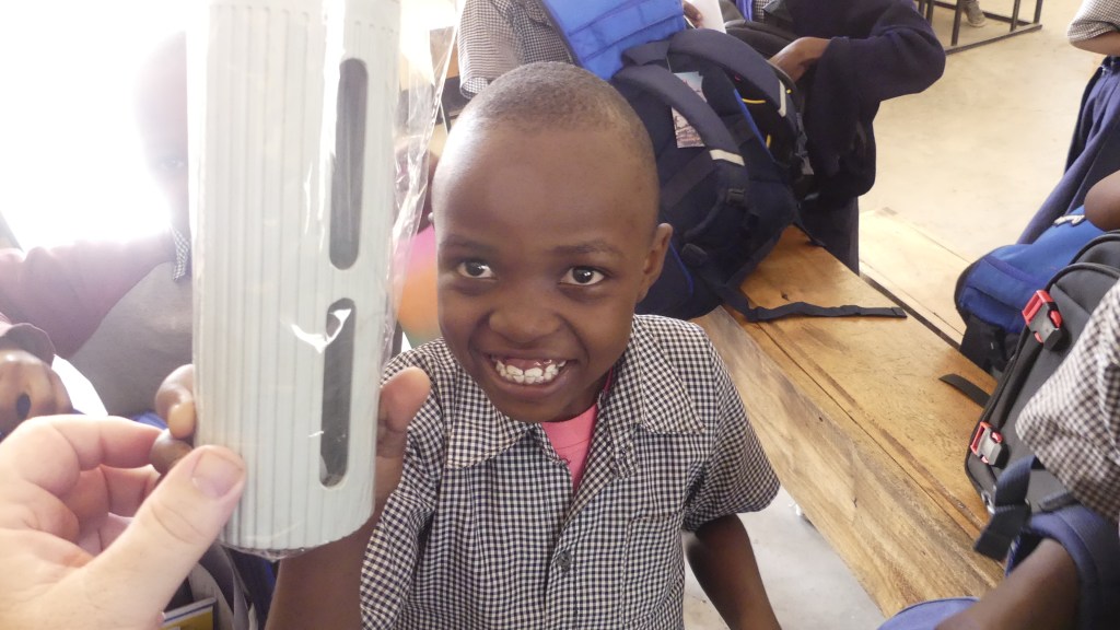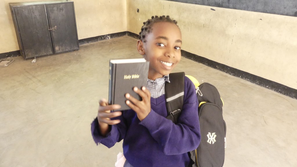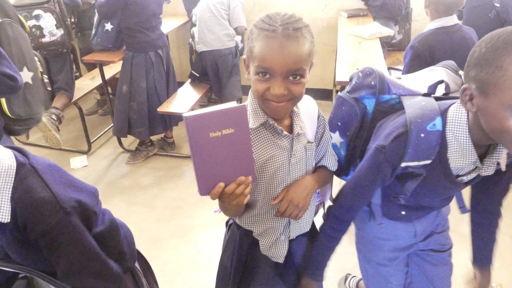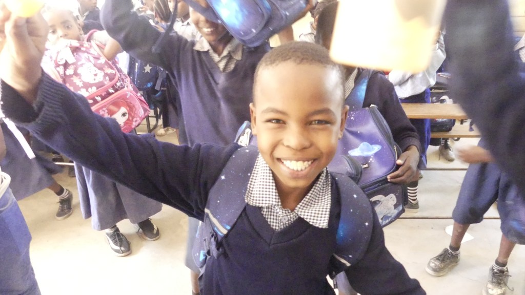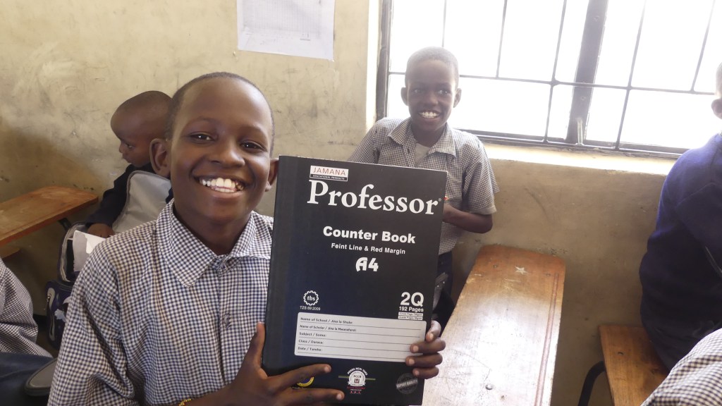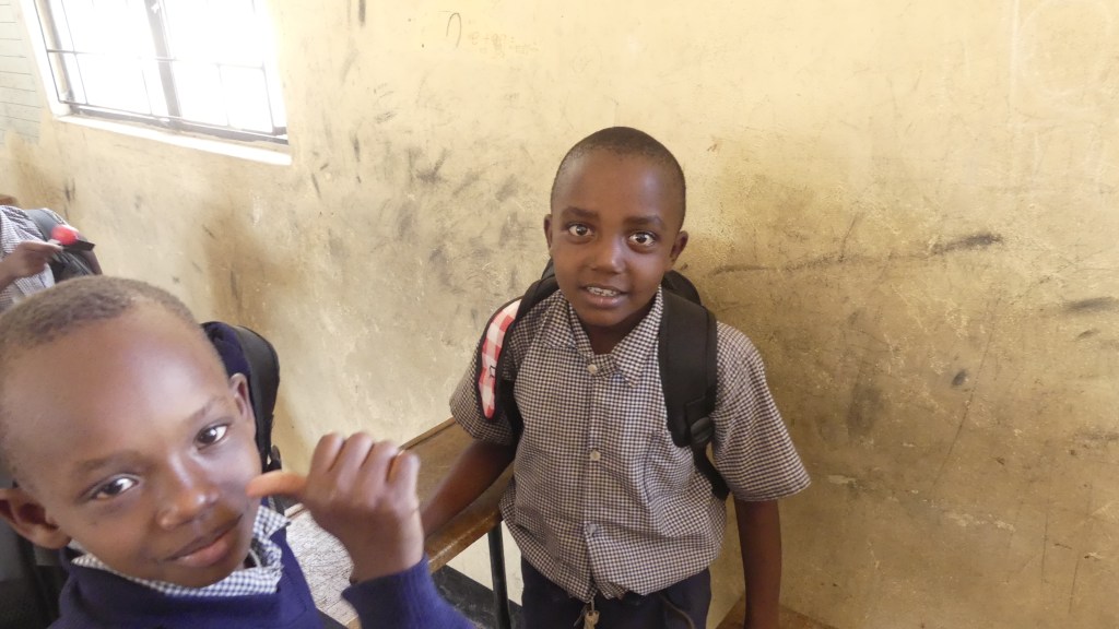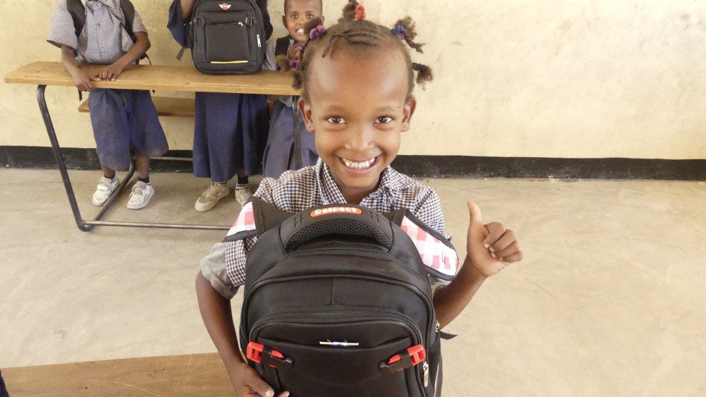 The bag above is what each student is given. The only differences is that preschool students get smaller bags and smaller notebooks but also a coloring book to go with their crayons. Standard 3 students also get a Bible with their bookbags. In case you cannot tell what all the items are there are exercise books, water bottle, balls (tennis or foam depending on age), toothpaste, toothbrush, soap, erasers, pencil sharpener, pencils, pens fingernail clippers, crayon 4 packs, suckers, crochet clothes and a book bag.