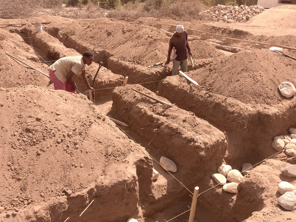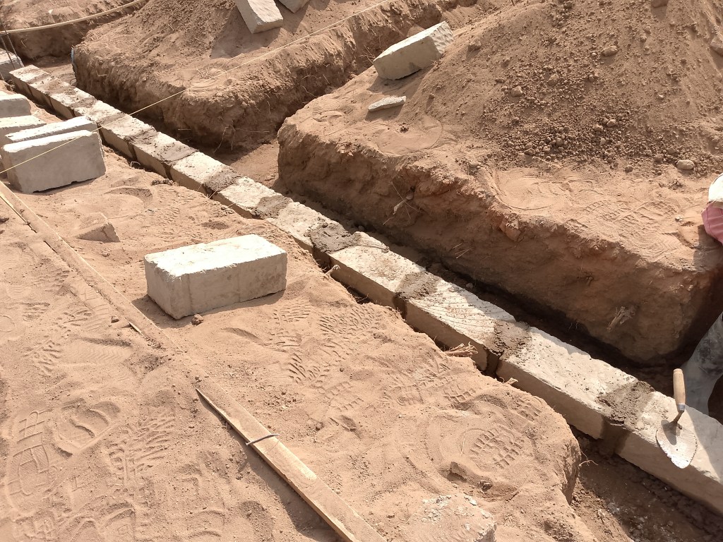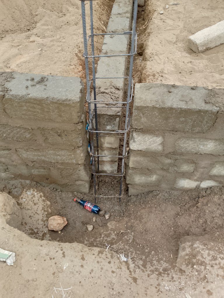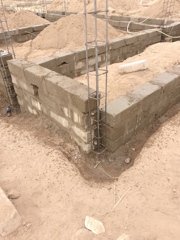 next it is placing rocks for the bottom of the footers. They they pour the footings and column footings next with rebar in place. Then they start the walls. It is common here to place the wall block up to the column rebar then cut it back by hand to give enough room for the column. Typically it is done this way because someone in charge forgets to tell the mason about the columns.
